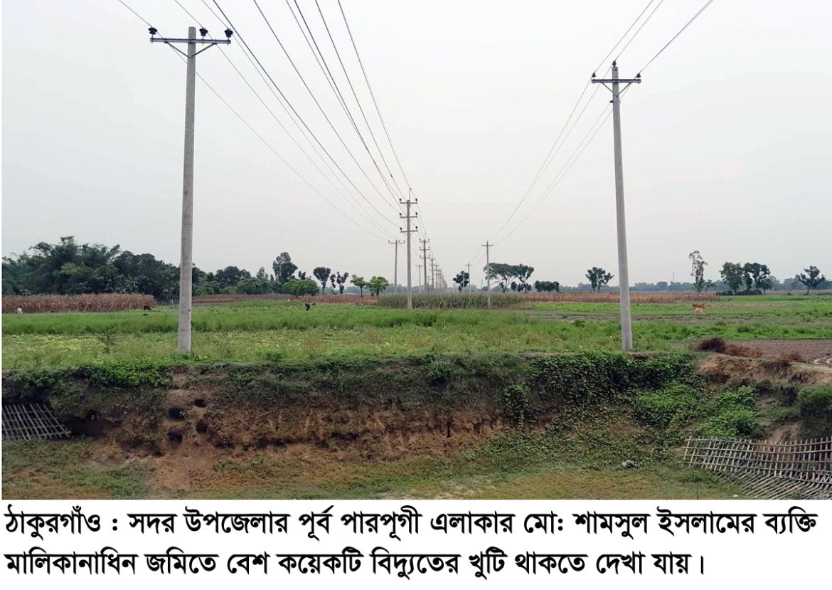 জানা যায়, পৌর শহরের মুন্সিপাড়া মহল্লার মো: শামসুল ইসলাম নামে ওই ব্যক্তি ২০০২ সালে সদর উপজেলার পারপূগী মৌজার অন্তর্ভুক্ত, জেএল নং-১৭৫ এর ১৪ দাগে মোট ৫০ শতক জমি কিনেন। তিনি ভোগ দখল শরু করার পর জমিতে বেশ কয়েকটি বিদ্যুতের খুটি পরার কারনে নানাবিধ সমস্যার মুখোমুখি হন। এ অবস্থায় উল্লেখিত জমিতে ভয়-ভয় করে চাষাবাদ করতে হয়। তিনি একাধিকবার ঠাকুরগাঁও পল্লী বিদ্যুৎ সমিতির স্বরনাপন্ন হলেও অদ্যাবাধি বিদ্যুতের খুটিগুলি অন্যত্র স্থানান্তরের কোন ব্যবস্থা না হওয়ায় ক্ষোভ প্রকাশ করেন তিনি।