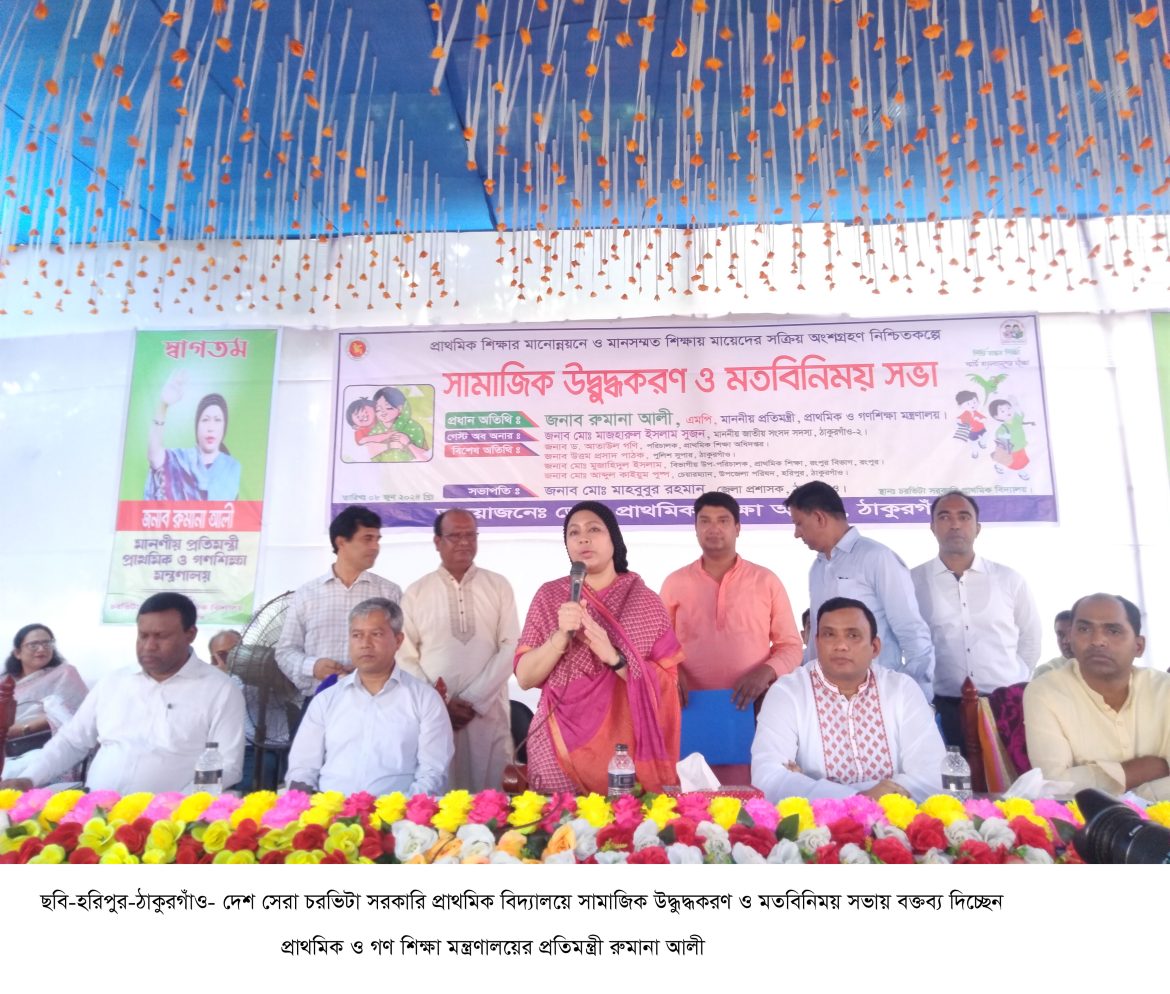 তিনি শনিবার সকালে জেলা প্রাথমিক শিক্ষা অফিস আয়োজিত ঠাকুরগাঁওয়ের হরিপুরে দেশ সেরা চরভিটা সরকারি প্রাথমিক বিদ্যালয় মাঠে সামাজিক উদ্ধুদ্ধকরণ ও মতবিনিময় সভায় প্রধান অতিথির বক্তবে এসব কথা বলেন।