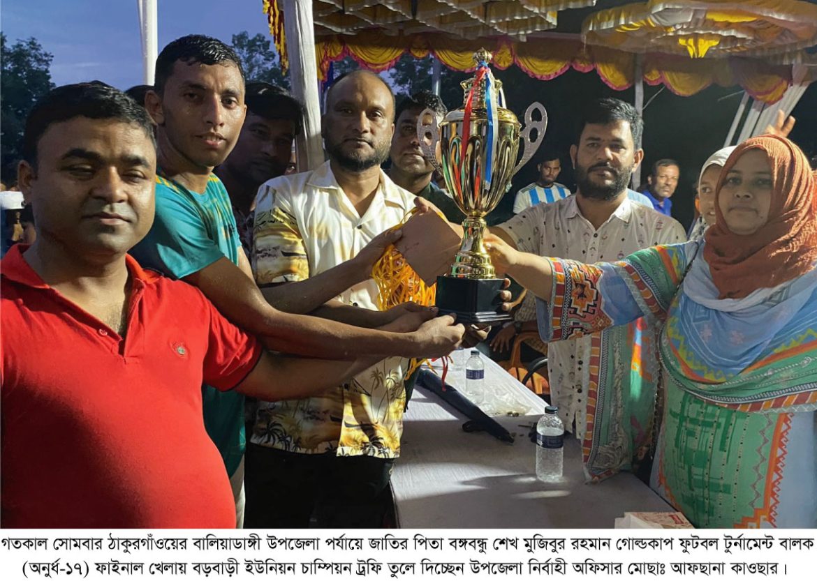 বালিয়াডাঙ্গী (ঠাকুরগাঁও) প্রতিনিধি: ঠাকুরগাঁওয়ের বালিয়াডাঙ্গী উপজেলা পর্যায়ে জাতির পিতা বঙ্গবন্ধু শেখ মুজিবুর রহমান গোল্ডকাপ ফুটবল টুর্নামেন্ট বালক (অনুর্ধ-১৭) ফাইনাল খেলায় ধনতলা ইউনিয়নকে ১-০ গোলে হারিয়ে বড়বাড়ী ইউনিয়ন চাম্পিয়ন হয়েছে।