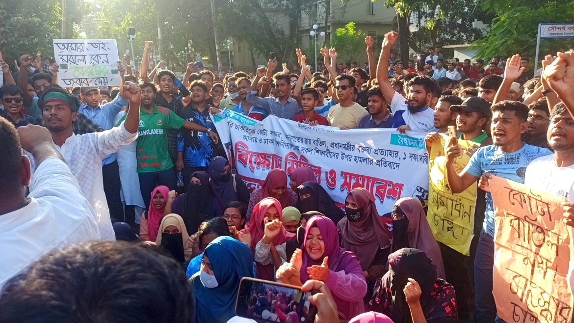এসময় ‘তুমি কে আমি কে, রাজাকারা রাজাকা’, ‘আমার ভাই মরল কেন, জবাব চাই, জবাব দে’, আমার ভাইয়ের রক্ত বৃথা যেতে দিব না, দিব না’ মেধা না কোটা, মেধা মেধা, আমাদের দাবি মানতে হবে মানতে হবেসহ নানা শ্লোগানে রাজ পথ কোম্পিত করে তুলেন তারা।