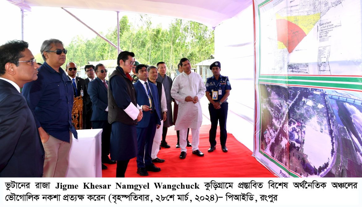 বৃহস্পতিবার (২৮শে মার্চ) দুপুরে কুড়িগ্রামে প্রস্তাবিত বিশেষ অর্থনৈতিক অঞ্চল পরিদর্শন করেন ভুটানের রাজা জিগমে খেসার নামগিয়েল ওয়াংচুক। পরিদর্শনের সময় তিনি প্রস্তাবিত বিশেষ অর্থনৈতিক অঞ্চলের ভৌগোলিক নকশা প্রত্যক্ষ করেন। এ সময় তথ্য ও সম্প্রচার প্রতিমন্ত্রী মোহাম্মদ আলী আরাফাত, কুড়িগ্রাম-২ আসনের সংসদ সদস্য ডা. হামিদুল হক খন্দকার, কুড়িগ্রাম-৪ আসনের সংসদ সদস্য বিপ্লব হাসান পলাশ, বাংলাদেশ অর্থনৈতিক অঞ্চল কর্তৃপক্ষের (বেজা) নির্বাহী চেয়ারম্যান শেখ ইউসুফ হারুন, জেলাপ্রশাসক মোহাম্মদ সাইদুল আরীফ ও পুলিশ সুপার আল আসাদ মোঃ মাহফুজুল ইসলাম উপস্থিত ছিলেন।