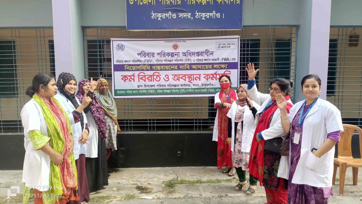 বুধবার দুপুরে ঠাকুরগাঁও পরিবার পরিকল্পনা পরিদর্শিকা, পরিবার পরিকল্পনা পরিদর্শক(ঋচও),পরিবার কল্যাণ সহকারী (ঋডঅ) এর ব্যানারে সদর উপজেলা পরিবার পরিকল্পনার কার্যালয়ের সামনে অবস্থান নেয় পরিবারকল্যাণ পরিদর্শিকা, পরিবার পরিকল্পনা পরিদর্শক ও পরিবার কল্যাণ সহকারীরা।