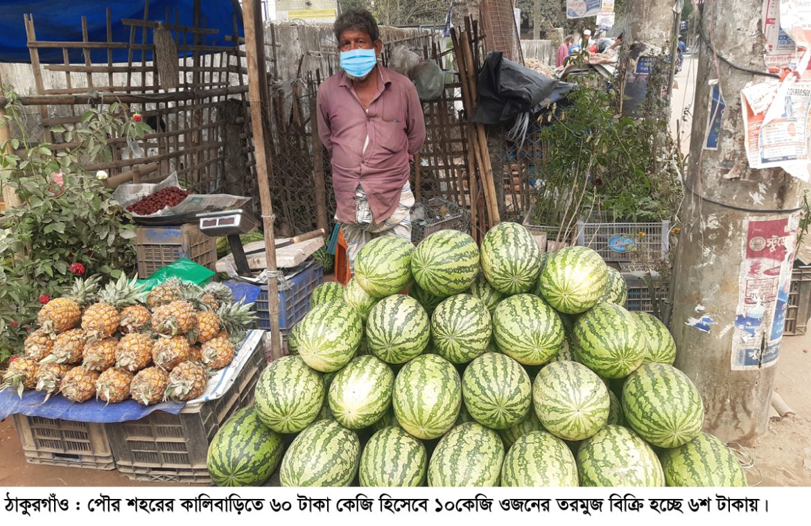 গতকাল বুধবার পৌর শহরের বিভিন্ন বাজারে তরমুজের বাজারদর ছিল, কেজি প্রতি প্রায় ৬০-৭০ টাকা পর্যন্ত। বর্তমানে ঠাকুরগাঁও জেলায় উৎপাদনকৃত তরমুজ বেশি পরিমানে বাজারে উঠেনি। ব্যবসায়িরা দেশের বিভিন্ন স্থান থেকে রমজানকে লক্ষ্য করে বড় মাপের তরমুজ ঠাকুরগাঁওয়ে এনে বিক্রি করছেন। এতে করে প্রতিটি তরমুজ ১০ থেকে ১৫ কেজি বা এর চেয়েও বেশি ওজনের। ফলে প্রতিটি ১৫ কেজির তরমুজ বিক্রি হচ্ছে ৯শ টাকায় যা নি¤œ ও মধ্যবিত্তদের ক্রয়ক্ষমতার বাহিরে। ফলে ক্রেতারা খুব বেশি তরমুজ কিনছেন না।