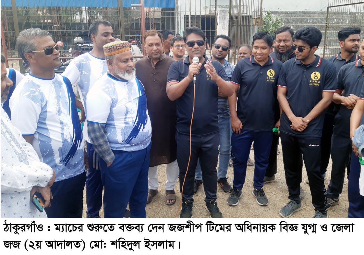 ঠাকুরগাঁও জজশীপ ও জেলা আইনজীবী সমিতির যৌথ আয়োজনে প্রীতি ক্রিকেট ম্যাচের শুরুতে বক্তব্য দেন জজশীপ টিমের অধিনায়ক বিজ্ঞ যুগ্ম ও জেলা জজ (২য় আদালত) মো: শহিদুল ইসলাম, জেলা আইনজীবী সমিতির সভাপতি এ্যাড. মো: আব্দুল হালিম, সাধারণ সম্পাদক মো: জয়নাল আবেদীন প্রমুখ। বিচার বিভাগের ব্যতিক্রমী এ ম্যাচটি উপভোগ করে কয়েকশ মানুষজন ও উভয় টিমের খেলোয়াড়, বিজ্ঞ বিচারক, কর্মকর্তা ও কর্মচারীগণ। ধারা বর্ণনা করেন স্বনামধন্য ধারাভাষ্যকার সুজন খান।