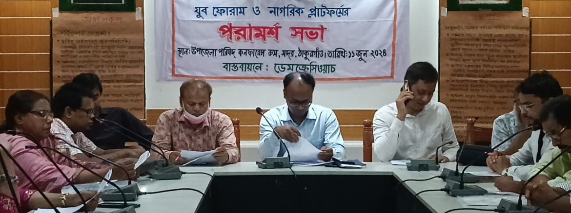 ডেমোক্রেসি ওয়াচের অর্থায়নে আস্থা প্রকল্পের আওতায় এ পরামর্শ সভায় বক্তব্য দেন বেলায়েত হোসেন,উপজেলা নির্বাহী অফিসার সদর, এমদাদ আলী উপজেলা যুব উন্নয়ন অফিসার, কৃস্ন রায় উপজেলা কৃষি অফিসার, আহসান হাবীব উপজেলা নিবাচন অফিসার, সাদেকুল ইসলাম, জেলা অফিসার জাতীয় মহিলা সংস্থা।