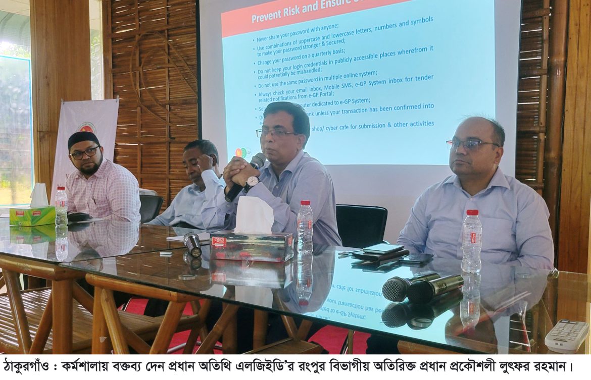 ঠাকুরগাঁও স্থানীয় সরকার প্রকৌশল অধিদপ্তর (এলজিইডি)’র আয়োজনে ও ডেভলপমেন্ট ডিজাইন এন্ড কনস্ট্রাকশন (ডিডিসি)’র সহযোগিতায় কর্মশালায় এলজিইডি’র নির্বাহী প্রকৌশলী মো: মামুন বিশ্বাসের সভাপতিত্বে বক্তব্য দেন প্রধান অতিথি এলজিইডি’র রংপুর বিভাগীয় অতিরিক্ত প্রধান প্রকৌশলী লুৎফর রহমান, বিশেষ অতিথি এস.ই অফিস দিনাজপুরের নির্বাহী প্রকৌশলী শামিম আখতার প্রমুখ।