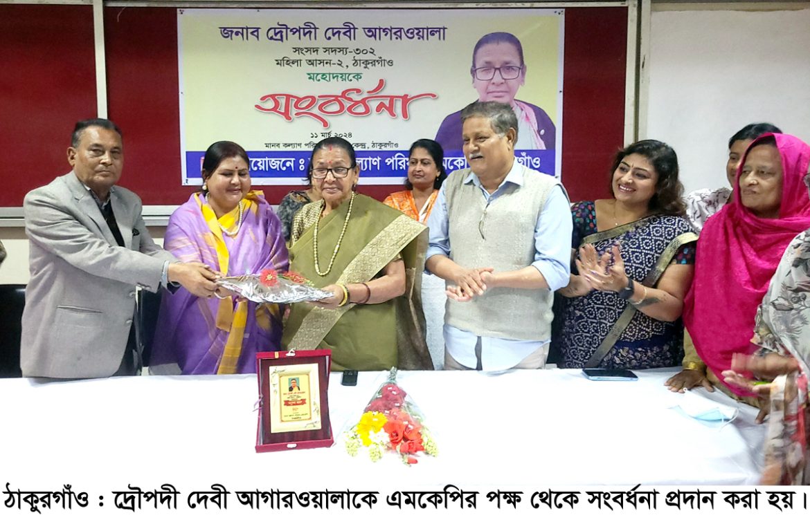 উন্নয়ন সংস্থা মানব কল্যাণ পরিষদ-এমকেপি’র আয়োজনে সংস্থার কার্যনির্বাহী কমিটির সভাপতি বিউটি বিশ^াসের সভাপতিত্বে বক্তব্য দেন নব নির্বাচিত সংসদ সদস্য দ্রৌপদী দেবী আগারওয়ালা, সংস্থাটির পরিচালক রবিউল আজম, ঠাকুরগাঁও প্রেসক্লাব সভাপতি মনসুর আলী, মহিলা আ’লীগের সাধারণ সম্পাদক মনোয়ারা হোসেন চৌধুরী, এমকেপির কর্মকর্তা মো: সাদেকুল ইসলাম, প্রেগ্রাম সমন্বয়কারী রাশেদুল আলম লিটন প্রমুখ। অনুষ্ঠান স ালনা করেন এমকেপির কর্মকর্তা ¯িœগ্ধা আক্তার। এ সময় দ্রৌপদী দেবী আগারওয়াকে সংস্থার পক্ষ থেকে ফুলেল শুভেচ্ছা জানিয়ে সংবর্ধনা প্রদান করা হয়