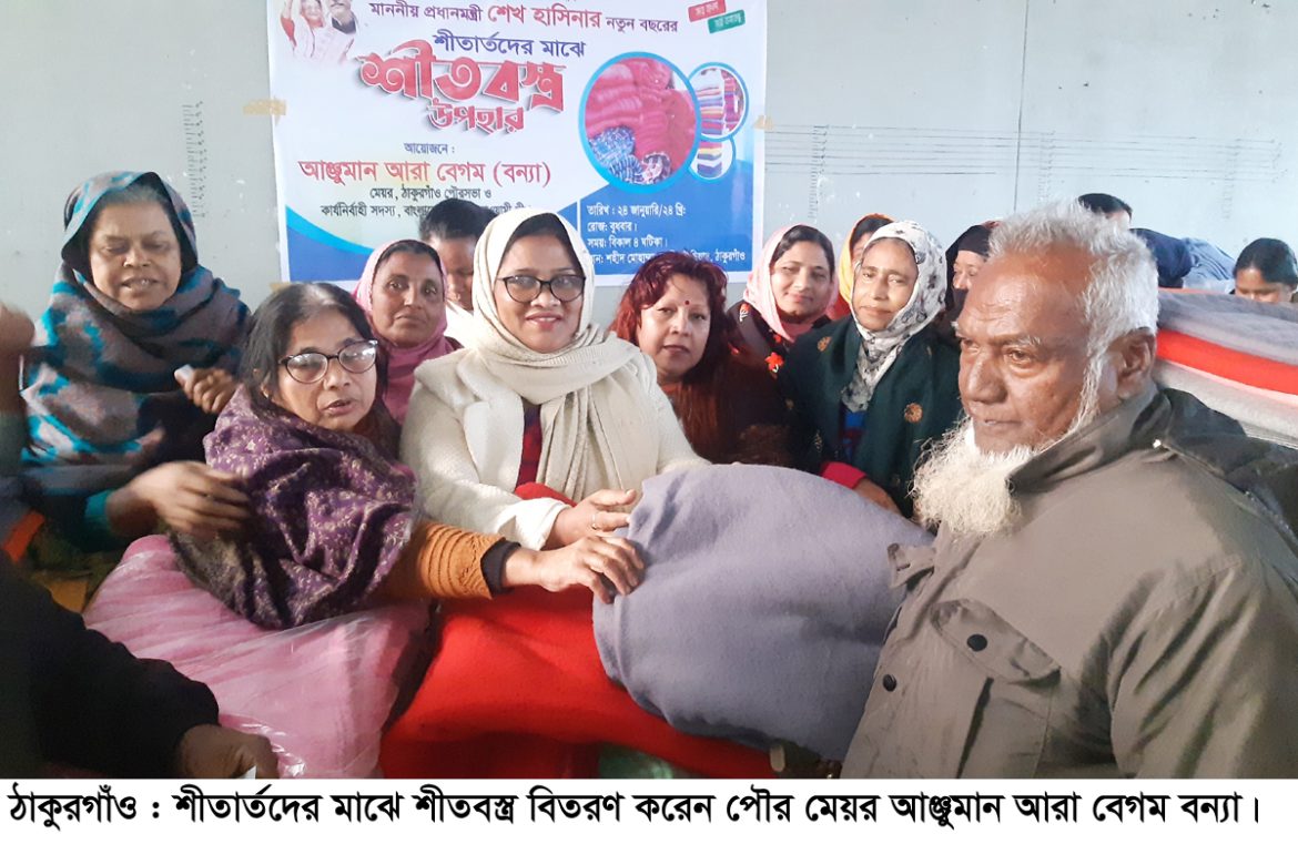 প্রধানমন্ত্রী শেখ হাসিনার নতুন বছরের শীতার্তদের মাঝে শীতবস্ত্র উপহারের অংশ হিসেবে ঠাকুরগাঁও পৌর মেয়র আঞ্জুমান আরা বেগম বন্যার আয়োজনে বিতরণকালে উপস্থিত ছিলেন জেলা ক্রীড়া সংস্থার ও পৌর আ’লীগের সাধারণস সম্পাদক মাসুদুর রহমান বাবু, জেলা ফুটবল এসোসিয়েশনের সভাপতি প্রবীর কুমার গুপ্ত বুয়াসহ পৌরসভার বিভিন্ন কর্মকর্তা-কর্মচারী ও সুবিধাভোগীগণ। এ সময় পৌর শহরের বিভিন্ন এলাকার ৬ শতাধিক শীতার্তদের মাঝে একটি করে কম্বল বিতরণ করা হয়।