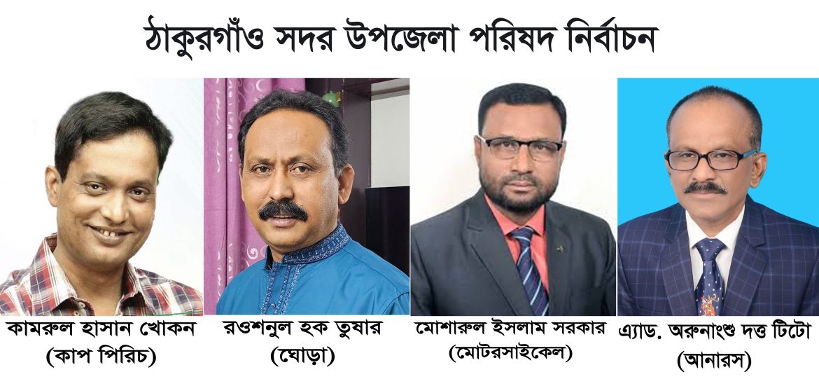জেলা রিটার্নিং অফিস সূত্রে জানা যায়, ষষ্ঠ উপজেলা পরিষদ নির্বাচনে ঠাকুরগাঁও সদর উপজেলায় চেয়ারম্যান পদে ৪ জন প্রার্থীর মধ্যে বর্তমান সদর উপজেলা চেয়ারম্যান ও সদর উপজেলা আ’লীগের সভাপতি এ্যাড. অরুনাংশু দত্ত টিটো (আনারস), সদর উপজেলা আ’লীগের সাধারণ সম্পাদক মোশারুল ইসলাম সরকার (মোটরসাইকেল), সাবেক জেলা পরিষদ সদস্য ও সদর উপজেলা আ’লীগের সহ সভাপতি রওশনুল হক তুষার (ঘোড়া) এবং সাবেক ছাত্রনেতা কামরুল হাসান খোকন (কাপ পিরিচ) প্রতীকে প্রতিদ্বন্দিতা করছেন।