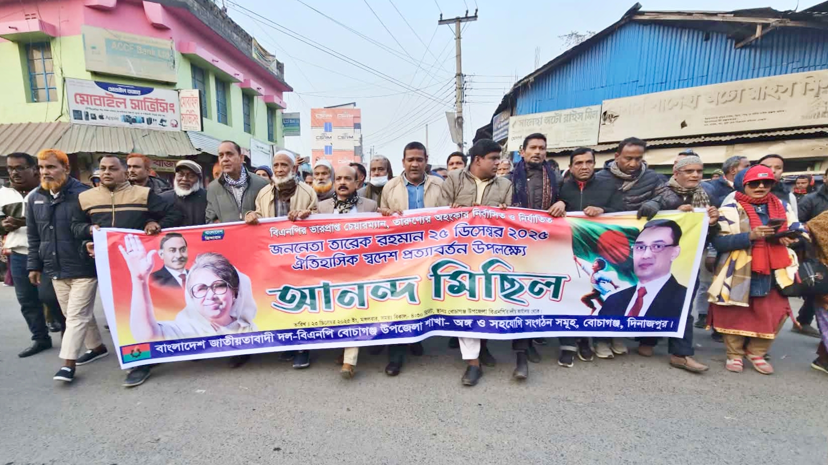 বোচাগঞ্জ (দিনাজপুর) প্রতিনিধি : আগামী ২৫ ডিসেম্বর  বিএনপির ভারপ্রাপ্ত চেয়ারম্যান তারেক রহমানের ঐতিহাসিক স্বদেশ প্রত্যাবর্তন উপলক্ষে বোচাগঞ্জে আনন্দ মিছিল অনুষ্ঠিত হয়েছে।
