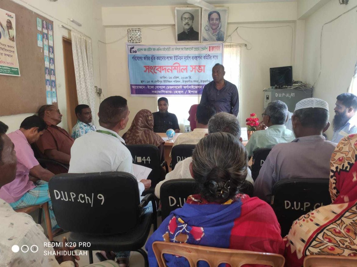 লোকায়ন রিপোর্ট: ইএসডিও প্রেমদীপ প্রকল্পের আয়োজনে হেক্স ইপারের সহযোগীতায় ঠাকৃুরগাঁও সদর উপজেলার ১৫নং দেবীপুর ইউনিয়ন পরিষদ সভাকক্ষে পরিবেশের ক্ষতির ঝুঁকি কমানোর লক্ষ্যে ইউনিয়ন দূর্যোগ ব্যবস্থাপনা কমিটির সাথে সংবেদনশীল সভা অনুষ্ঠীত হয় । উক্ত সভায় সভাপতিত্ব করেন দেবীপুর ইউনিয়নের চেয়ারম্যান জনাব মোঃ মোয়াজ্জেম হোসেন সভায় উপস্থিত ছিলেন দেবীপুর ইউনিয়নের দায়িত্বপ্রাপ্ত ইউনিয়ন সমাজকর্মী জনাব মিনাল চন্দ্র রায় , বৈরাগীহাট বালিকা উচ্চ বিদ্যালয়ের সহকারী শিক্ষক হরিকিংকর রায় সহ কমিটির অন্যান্য সদস্যবৃন্দ , ইউপি সদস্যবৃন্দ ।সভায় স্বাগত বক্তব্য রাখেন ইএসডিও-প্রেমদীপ প্রকল্পের উপজেলা ম্যানেজার মোঃ ওয়ালিউর রহমান , আরো বক্তব্য রাখেন ৪ নং ওয়ার্ডের ইউপি সদস্য জনাব মোঃ জামাল ও ৮ নং ওয়ার্ডেও ইউপি সদস্য জনাব মোঃ সইমদ্দিন, টেপাগাঁও গ্রাম উন্নয়ন কমিটির সভাপতি মন্টু পাহান, মুজাবুন্নির রুবেল মুর্মু। সভাটি পরিচালনা করেন ইএসডিও প্রেমদীপ প্রকল্পের কমিউনিটি ফ্যাসিলিটেটর মোছাঃ শাহিনা খাতুন। সভায় সভাপতি পরিবেশের ক্ষতির ঝুকি কমানোর লক্ষ্যে ইউনিয়নের বিভিন্ন এলাকায় গাছ লাগানোর জন্য কমিটি গঠন করেন এবং ইউনিয়ন পরিষদ থেকে ফ্রি গাছ বিতরন করার সিধান্ত দেন এর পাশাপাশি দেবিপুর ও মুজাবুন্নি কমিউনিটিতে কমিউনিটি ল্যাট্রিন , টিউবওয়েল ,মুজাবুন্নি কমিউনিটিতে একটি ব্রীজ ও কাচাঁ রাস্তায় মাটি ভরাট করার জন্য প্রতিশ্রুতি দেন।