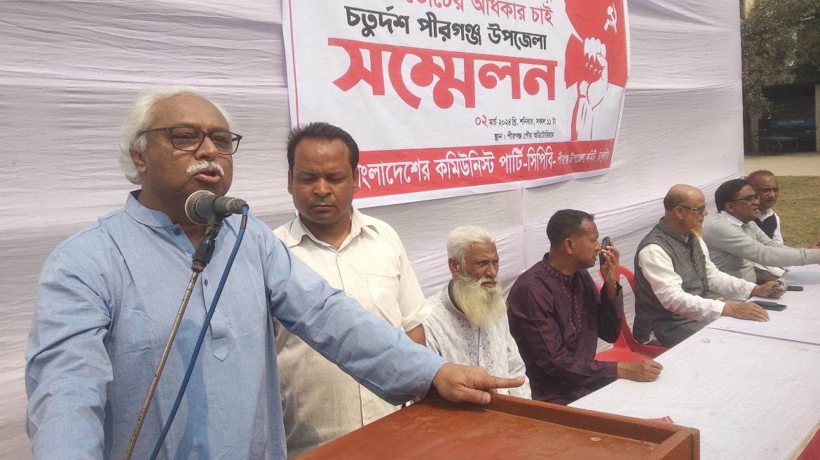 স্টাফ রিপোর্টার, পীরগঞ্জ : বাংলাদেশের কমিউনিষ্ট পার্টির কেন্দ্রীয় কমিটির সাধারণ সম্পাদক রুহিন হোসেন পিন্স বলেছেন, যারা খেটে টাকা তৈরী করে তাদের পকেট থাকে ফাঁকা আর যারা টাকা তৈরী করে না তাদের পকেট থাকে মোটা। এটা কি আইন ? এটা কি ইনসাব?। এটা বে-আইনী। দেশের বর্তমান এ বে আইনী পন্থা ভাংতে চায় লাল ঝান্ডার কমিউনিষ্ট পাটি। শনিবার দুপুরে ঠাকুরগাঁওয়ের পীরগঞ্জ পৌর অডিটোরিয়ামে পীরগঞ্জ উপজেলা শাখার চতুর্দশ সম্মেলনের প্রথম অধিবেশনে প্রধান অতিথির বক্তব্যে তিনি এসব কথা বলেন। “দুঃশাসন হটাও-ব্যবস্থা বদলাও-বিকল্প গড়ো” এই শ্লোগানকে সামনে রেখে ভাত ও ভোটের অধিকার নিশ্চিত করার লক্ষে উপজেলা সিপিবি’র সভাপতি প্রভাত সমির শাহজাহানের সভাপতিত্বে অনুষ্ঠিত সম্মেলনের প্রথম অধিবেশনে অন্যান্যের মধ্যে বক্তব্য দেন, পার্টির কেন্দ্রীয় কমিটির সদস্য আশরাফুল ইসলাম, জেলা সভাপতি ইয়াকুব আলী, ও সাধারণ সম্পাদক অ্যাড. আবু সায়েম। এ সময় জেলা ও উপজেলা কমিটির অন্যান্য নেতৃবৃন্দ উপস্থিত ছিলেন। পরে একটি র‌্যালী বের করা হয়। র‌্যালীটি শহরের বিভিন্ন সড়ক প্রদক্ষিন শেষে পৌর অডিটোরিয়ামে এসে শেষ হয়।