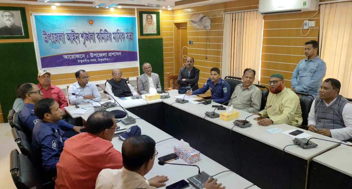 ঠাকুরগাঁও সদর উপজেলার নির্বাহী অফিসার মো. বেলায়েত হোসেনের সভাপতিত্বে আইনশৃঙ্খলা সভায় বক্তব্য দেন, ঠাকুরগাঁও সদর উপজেলার চেয়ারম্যান ও সদর উপজেলা আওয়ামী লীগের সভাপতি অ্যাড. অরুনাংশু দত্ত টিটো, জেলা আওয়ামী লীগের ত্রাণ ও সমাজকল্যাণ বিষয়ক সম্পাদক নজরুল ইসলাম স্বপন সহ সদর উপজেলার তিনটি থানার অফিসার ইনচার্জ, সদর উপজেলার ২২টি ইউনিয়নের চেয়ারম্যান সহ সরকারি বিভিন্ন দপ্তরের কর্মকর্তারা।