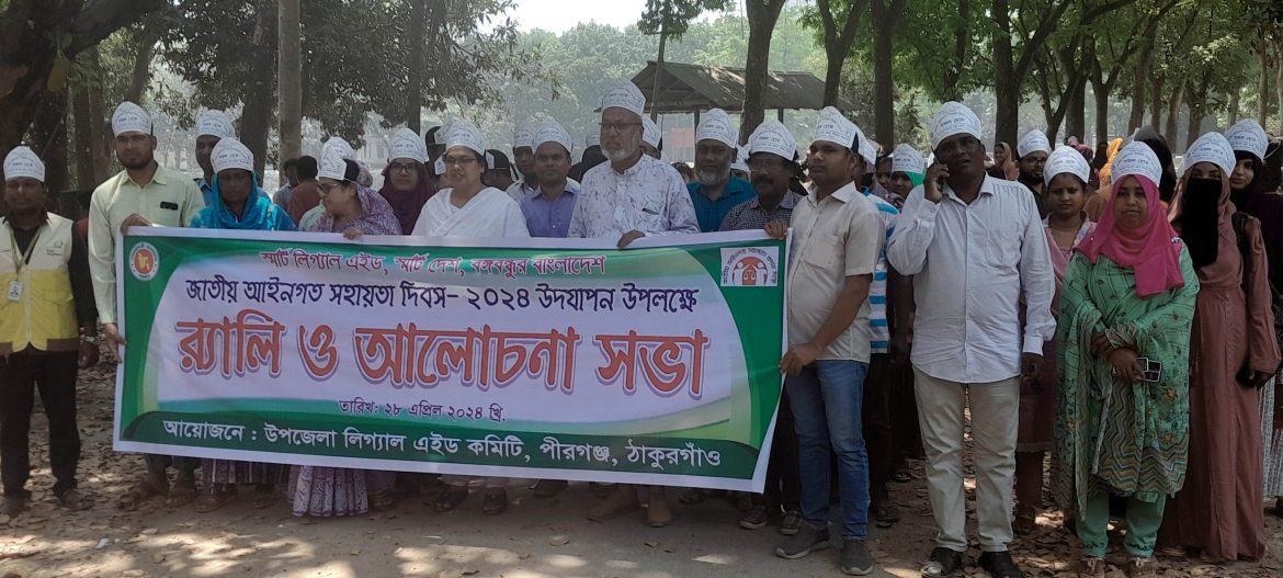 স্টাফ রিপোর্টার, পীরগঞ্জ ঃ জাতীয় আইনগত সহায়তা দিবস উপলক্ষে র্যালী ও আলোচনা সভা হয়েছে ঠাকুরগাঁওয়ের পীরগঞ্জে। রবিবার সকালে উপজেলা পরিষদ চত্বরে র্যালী বের করা হয়। র্যালী শেষে উপজেলা পরিষদ সভাকক্ষে আলোচনা সভা হয়। এতে বক্তব্য দেন, উপজেলা চেয়ারম্যান আখতারুল ইসলাম, উপজেলা শিক্ষা অফিসার হাবিবুল ইসলাম, উপজেলা মহিলা আওয়ামীলীগের সভাপতি দেলোয়ারা বুলবুল, উপজেলা তথ্য আপা মুন্নি বেগম, পীরগঞ্জ প্রেসক্লাবের সভাপতি জয়নাল আবেদিন বাবুল প্রমূখ। এ সময় উপজেলা মহিলা বিষয়ক কর্মকর্তা জিন্নাতারা ইয়াছমিন, প্রেসক্লাবের সাধারণ সম্পাদক নসরতে খোদা রানা সহ সরকারি কর্মকর্তা, এনজিও প্রতিনিধি ও উপকারভোগীরা উপস্থিত ছিলেন।