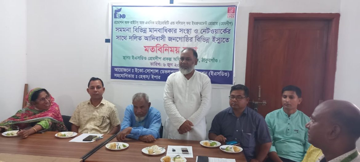 স্টাফ রিপোর্টার, পীরগঞ্জ ঃ সমমনা বিভিন্ন মানবাধিকার সংস্ধা ও নেটওয়ার্কেনর সাথে আদিবাসী জনগোষ্ঠীর বিভিন্ন ইস্যুতে মতবিনিময় সভা হয়েছে ঠাকুরগাঁওয়ের পীরগঞ্জে। বৃহস্পতিবার সকালে ইএসডিও নামে একটি বে সরকারী সংস্থার পীরগঞ্জ কার্যালয়ে এ সভা হয়। বীর মুক্তিযোদ্ধা হাফিজুর রহমানের সভাপতিত্বে অনুষ্ঠিত সভায় বক্তব্য দেন, পীরগঞ্জ প্রেসক্লাবের সভাপতি জয়নাল আবেদিন বাবুল, উপজেলা হিন্দু বৌদ্ধ খ্রীস্টান ঐক্য পরিষদের সাধারণ সম্পাদক গোপী কৃষ্ণ রায়, উপজেলা খ্রীস্টান এসোসিয়েশনের সভাপতি বিষ্ণুপদ রায়, সমাজ সেবক খাজির উদ্দীন, এএসডিও’র উপজেলা ম্যানেজার অনুন চন্দ্র রায়, আদিবাসী নেতা দাওদ সরেন, কাচেন্দ্র নাথ ঋষি প্রমূখ।