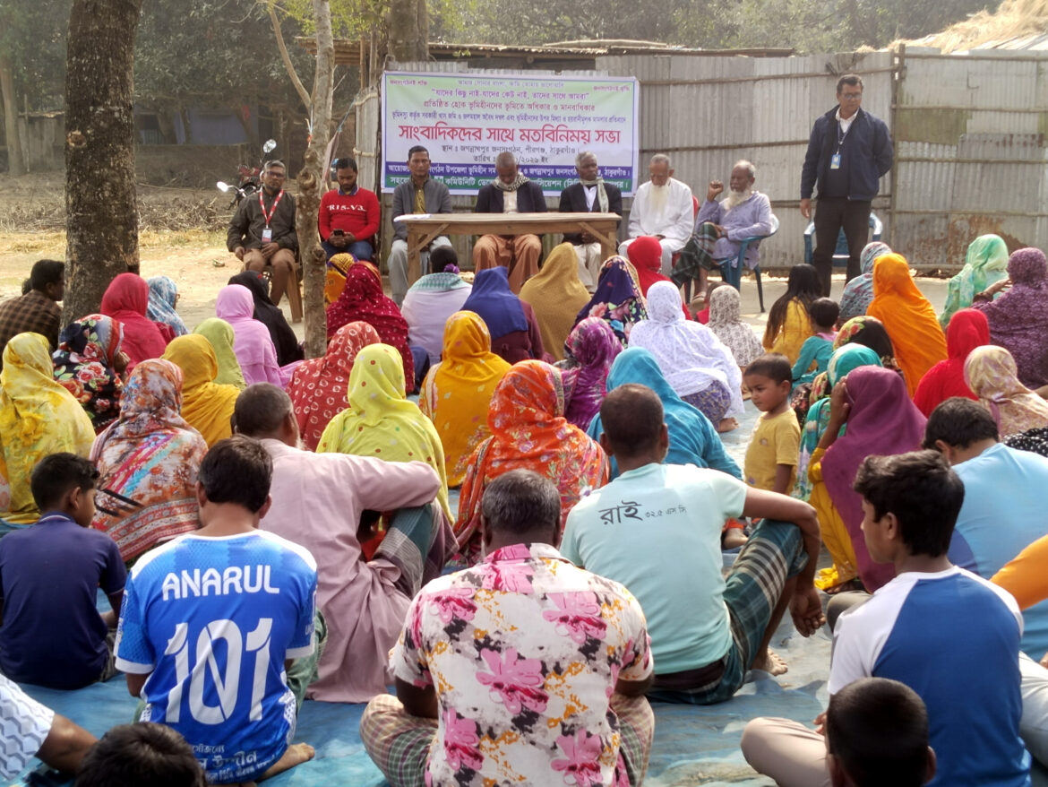 পীরগঞ্জ প্রতিনিধি : দীর্ঘদিন ধরে সরকারি খাসজমি বন্দোবস্তের জন্য আবেদন করে না পাওয়ায় ঠাকুরগাঁওয়ের পীরগঞ্জ উপজেলার বৈরচুনা ইউনিয়নের শেয়ালডাঙ্গী গ্রামের ১৭২টি ভূমিহীন পরিবার উচ্ছেদ আতঙ্কে রয়েছেন বলে অভিযোগ উঠেছে। একটি মহল নিয়মিত তাদের বাড়িঘর ভেঙে দেওয়ার হুমকি দিচ্ছেন বলেও অভিযোগ করেছেন ভূমিহীনরা। সোমবার দুপুরে জগন্নাথপুর ভূমিহীন জনসংগঠনের উদ্যোগে সাংবাদিকদের সঙ্গে মতবিনিময় সভায় এসব অভিযোগ করেন ভুক্তভোগী ভূমিহীনরা।