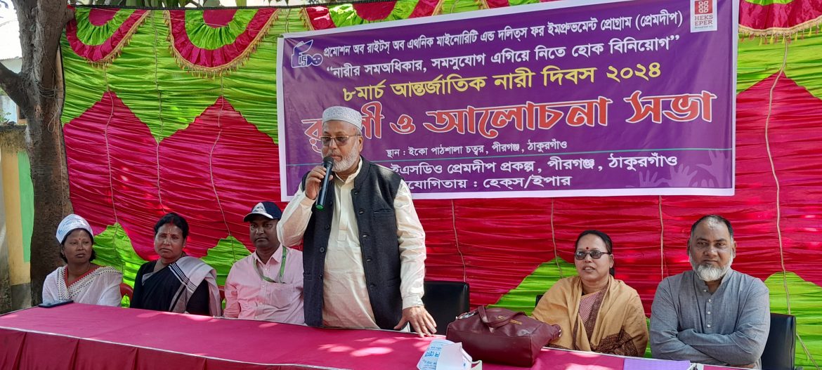 স্টাফ রিপোর্টার, পীরগঞ্জ: “নারীর সমঅধিকার, সমসুযোগ, এগিয়ে নিতে হোক বিনিয়োগ” এই প্রতিপাদ্যে ঠাকুরগাঁওয়ের পীরগঞ্জে র্যালী ও আলোচনা সভা হয়েছে। শুক্রবার ইএসডিও’র পীরগঞ্জ অফিস চত্বরে প্রেমদীপ প্রকল্পের আয়োজনে র্যালী শেষে অনুষ্ঠিত আলোচনা সভায় বক্তব্য দেন, উপজেলা চেয়ারম্যান আখতারুল ইসলাম, উপজেলা মহিলা ভাইস চেয়ারম্যান ভারতি রানী রায়, পীরগঞ্জ প্রেসক্লাবের সভাপতি জয়নাল আবেদিন বাবুল সহ অন্যরা। এ সময় ইএসডিও’র উপজেলা ম্যানেজার অরুন চন্দ্র রায় সহ বিভিন্ন এলাকা থেকে আগত সুফলভোগী ও স্থানীয় গন্যমান্য ব্যক্তিবর্গ উপস্থিত ছিলেন।