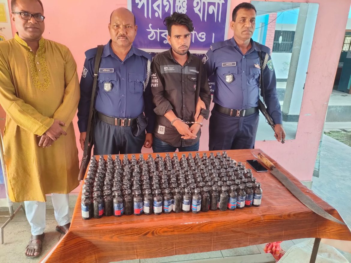 স্টাফ রিপোর্টার, পীরগঞ্জ: ঠাকুরগাঁওয়ের পীরগঞ্জে দেশি অস্ত্র ও ১৮৬ বোতল ফেন্সিডিল সহ মেজবাহুল নামে এক যুবককে গ্রেপ্তার করেছে র্যাব-১৩। বৃহস্পতিবার রাতে উপজেলার জাবরহাট ইউনিয়নের চৌরঙ্গী অষ্টপ্রহর বাজার এলাকায় পল্লী বিদ্যুৎ অফিসের সামনে থেকে তাকে গ্রেপ্তার করা হয়। মেজবাহুল উপজেলার চন্দরিয়া গ্রামের মকলেসুর রহমানের ছেলে এবং বিকাশ ও ফেক্্িরলোড ব্যবসায়ী ইসাহাক আলী হত্যা মামলার আসামী।