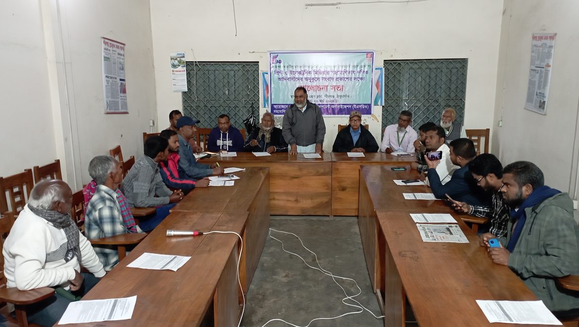 স্টাফ রিপোর্টার, পীরগঞ্জ : ঠাকুরগাঁওয়ের পীরগঞ্জে আদিবাসীদের সাফল্য, সম্ভাবনা ও নানা সমস্যা নিয়ে সাংবাদিকদের সাথে মত বিনিময় সভা হয়েছে। বুধবার দুপুরে ইএসডিও নামে একটি বে সরকারি সংস্থার আয়োজনে পীরগঞ্জ প্রেসক্লাব হলরুমে এ সভা হয়। প্রেসক্লাবের সভাপতি জয়নাল আবেদিন বাবুলের সভাপতিত্বে সভায় বক্তব্য দেন, প্রেসক্লাবের সাধারণ সম্পাদক নসরতে খোদা রানা, সাবেক সভাপতি মেহের এলাহী, ইএসডিও প্রেমদ্বীপ প্রকল্পের পরিচালক কাজী সিরাজুস সালেকিন, ইকোমিক ডেভলপমেন্ট অফিসার রওশন জামান, উপজেলা ম্যানেজার অরুন চন্দ্র রায়, আদিবাসী নেতা শুভ হেমবরম, লুকাশ টুডু, সুধির চন্দ্র দাস, ললতি দাস, সাংবাদিক মামুনুর রশিদ, বাদল হোসেন, মুনসুর আলী, আবু তারেক বাঁধন প্রমূখ।