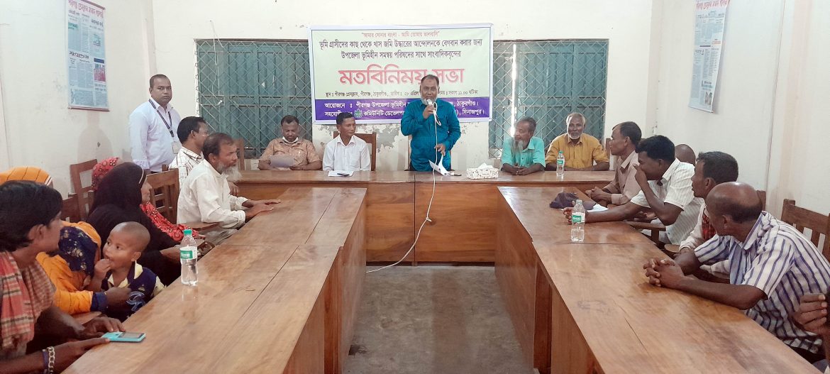 স্টাফ রিপোর্টার, পীরগঞ্জ ঃ ভুমিগ্রাসীদের কাছ থেকে খাস জমি উদ্ধারের আন্দোলনকে বেগবান করতে সাংবাদিকদের সাথে উপজেলা ভুমিহীন সমন্বয় পরিষদ মত বিনিময় সভা করেছেন। রবিবার দুপুরে পীরগঞ্জ প্রেসক্লাব সভা কক্ষে সিডিএ’র সহযোগীতায় উপজেলা ভুমিহীন সমন্বয় পরিষদের সভা প্রধান অবিনাশ চন্দ্র রায়ের সভাপতিত্বে অনুষ্ঠিত সভায় বক্তব্য দেন, পীরগঞ্জ প্রেসক্লাবের সভাপতি জয়নাল আবেদিন বাবুল, কোষাধ্যক্ষ দেলোয়র হোসেন দুলাল, সিডিএ’র আ লিক সমন্বয়কারী কাউসারুল আলম, ভুমিহীন নেতা নুরু মিয়া, সলেমন রায়, নরেন দাস, নির ন রায় প্রমূখ।