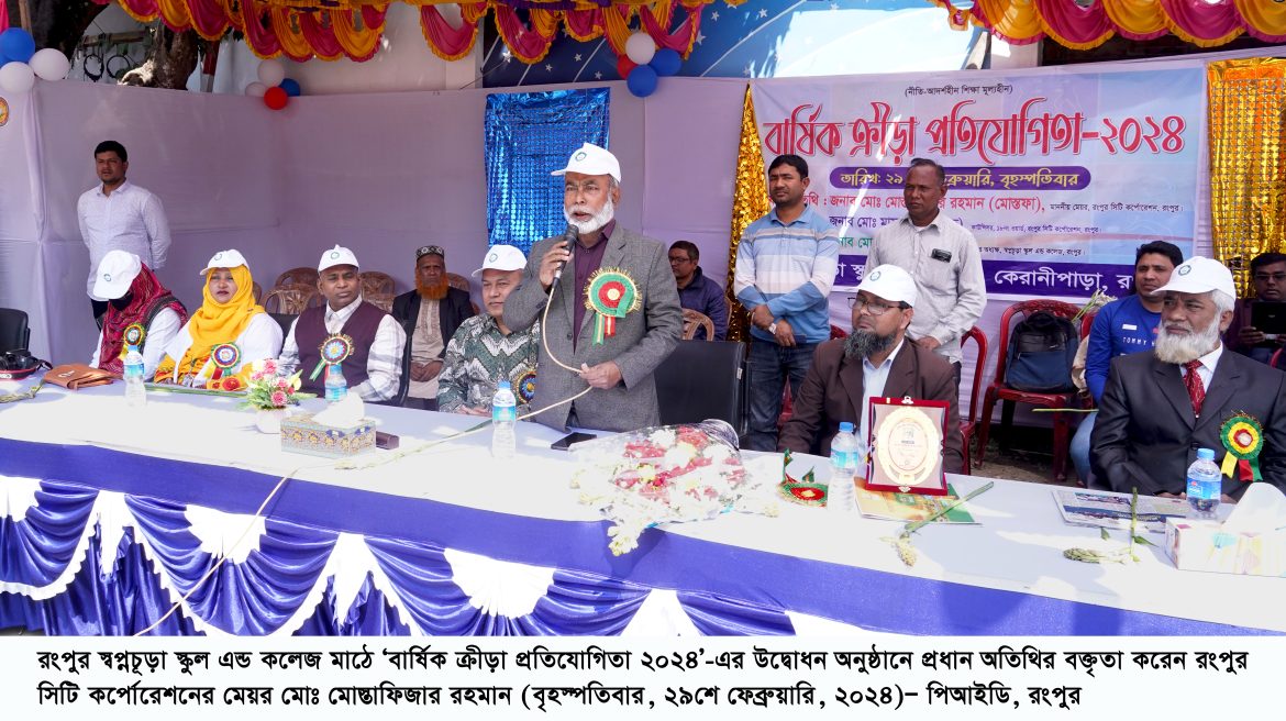 বার্ষিক ক্রীড়া প্রতিযোগিতা শিক্ষার গুরুত্বপূর্ণ অংশ। ক্রীড়া প্রতিযোগিতা শিশুদের শারীরিক ও মানসিক বিকাশে সহায়ক ভূমিকা রাখে। বৃহস্পতিবার (২৯শে ফেব্রুয়ারি) রংপুর স্বপ্নচূড়া স্কুল অ্যান্ড কলেজ মাঠে বার্ষিক ক্রীড়া প্রতিযোগিতা ২০২৪-এর উদ্বোধন অনুষ্ঠানে প্রধান অতিথির বক্তৃতায় রংপুর সিটি কর্পোরেশনের মেয়র মোঃ মোস্তাফিজার রহমান এসব কথা বলেন।