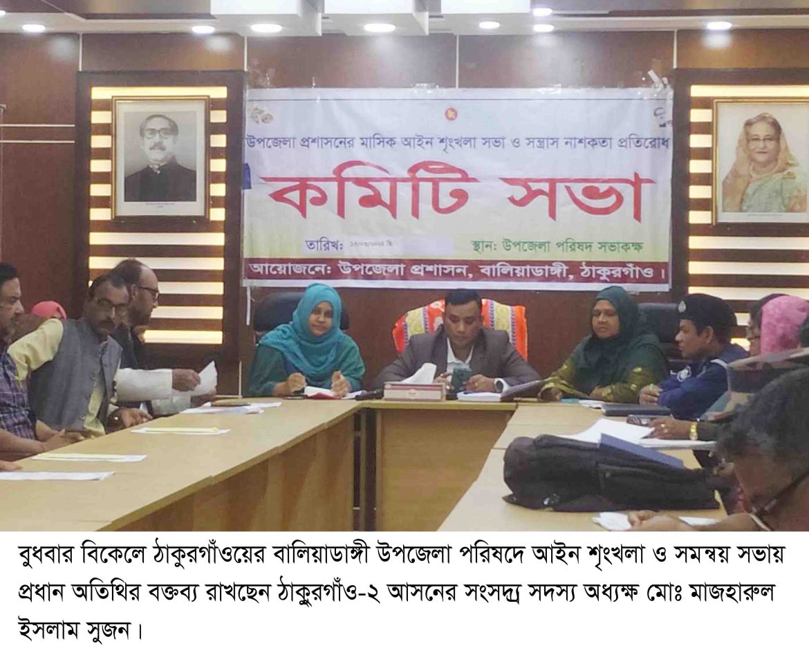 সভায় প্রধান অতিথি হিসেবে উপস্থিত ছিলেন, ঠাকুরগাঁও-২ আসনের সংসদ সদস্য অধ্যক্ষ মোঃ মাজহারুল ইসলাম সুজন। উপজেলা নির্বাহী অফিসার আফছানা কাওছারের সভাপতিত্বে আইন শৃংখলা সভায় বক্তব্য রাখেন, উপজেলা পরিষদের প্যানেল চেয়ারম্যান-১ আলেয়া পারভীন, ভাইস চেয়ারম্যান মাজেদুর রহমান, উপজেলা আওয়ামীলীগের সভাপতি মোহাম্মদ আলী, সাধারণ সম্পাদক এ্যড. আবু হাসনাত বাবু, ইউপি চেয়ারম্যান আকালু, দিলিপ কুমার চ্যাটার্জি, সমর কুমার চ্যাটার্জি, ফজলে রাব্বী রুবেল, বালিয়াডাঙ্গী প্রেস ক্লাবের সভাপতি রমজান আলী, সরকারি কর্মকর্তা প্রমুখ। আইন শৃংখলা সভা শেষে উপজেলা পরিষদের প্যানেল চেয়ারম্যান-১ আলেয়া পারভীনের সভাপতিত্বে সমন্বয় সভা অনুষ্ঠিত হয়।