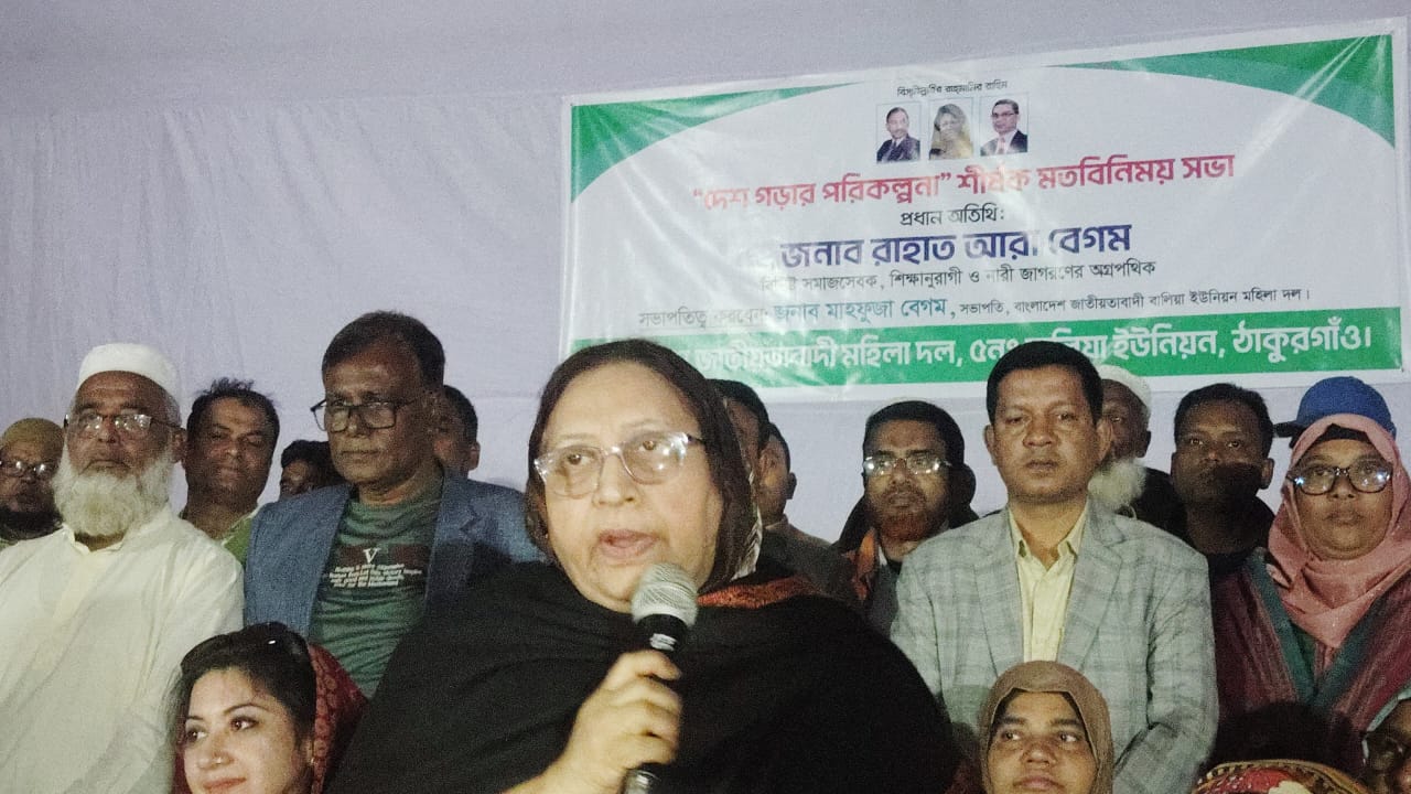 মির্জা ফখরুলের স্ত্রী রাহাত আরা বেগম বলেন, গণতন্ত্র ও ভোটাধিকার প্রতিষ্ঠা ছাড়া দেশের কাক্সিক্ষত উন্নয়ন সম্ভব নয়। তাই আসুন ঠাকুরগাঁওয়ের উন্নয়নের স্বার্থে সকলেই ঐক্যবদ্ধ থাকি। আসন্ন নির্বাচনে আপনাদের অতি পরিচিত মানুষ আমার স্বামী মির্জা ফখরুল। তিনি বহু অত্যাচার-নির্যাতন সহ্য করেছেন এগুলো আপনারা সকলেই জানেন। মির্জা ফখরুল ঠাকুরগাঁওয়ের গর্ব। তার সম্পর্কে নতুন করে বলার কিছু নাই। আপনাদের কাছে আমার একটাই চাওয়া, সেটি হলো- আসন্ন জাতীয় সংসদ নির্বাচনে আপনারা সকলেই এক হয়ে মির্জা ফখরুলের ধানের শীষ প্রতীকে ভোট দিবেন। আপনাদের ভোট বিপ্লবের মাধ্যমেই গণতন্ত্র পুনরুদ্ধার ও দেশের সুশাসন নিশ্চিত করা সম্ভব।