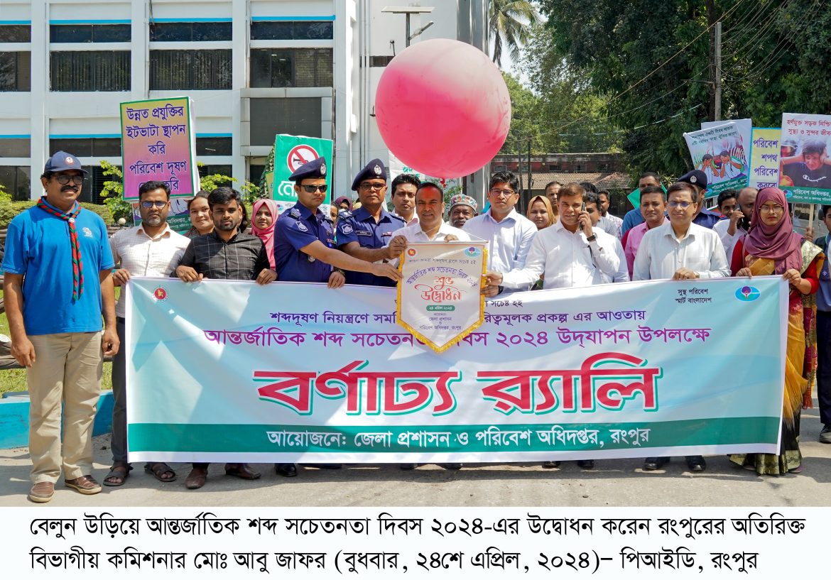 পিআইডি: ‘আসুন আমরা শব্দদূষণ হ্রাসে সচেষ্ট হই’—এ প্রতিপাদ্য নিয়ে রংপুরে আন্তর্জাতিক শব্দ সচেতনতা দিবস, ২০২৪ উদ্‌যাপিত হয়েছে। বুধবার (২৪শে এপ্রিল) দিবসটি উপলক্ষ্যে রংপুর জেলাপ্রশাসকের সম্মেলনকক্ষে সচেতনতামূলক এক আলোচনাসভা অনুষ্ঠিত হয়। রংপুর জেলাপ্রশাসন ও পরিবেশ অধিদপ্তরের যৌথ উদ্যোগে আয়োজিত সভায় প্রধান অতিথি হিসাবে উপস্থিত ছিলেন রংপুরের অতিরিক্ত বিভাগীয় কমিশনার মোঃ আবু জাফর। অনুষ্ঠানে সভাপতিত্ব করেন জেলাপ্রশাসক মোহাম্মদ মোবাশ্বের হাসান।