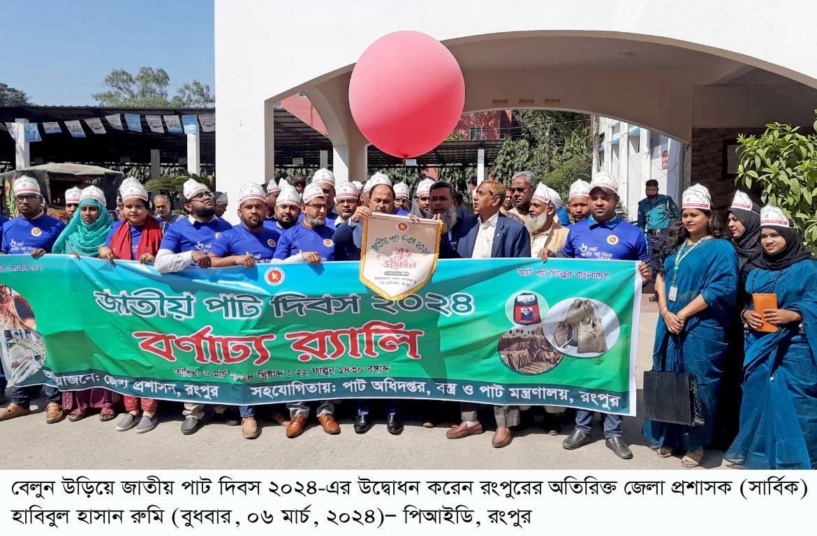 ‘বঙ্গবন্ধুর সোনার দেশ, স্মার্ট পাটশিল্পের বাংলাদেশ’– এই প্রতিপাদ্য নিয়ে রংপুরে ‘জাতীয় পাট দিবস-২০২৪’ উদ্যাপিত হয়েছে। বুধবার (৬ই মার্চ) রংপুর জেলাপ্রশাসক কার্যালয়ের কম্পিউটারল্যাবে জাতীয় পাট দিবস উপলক্ষ্যে এক আলোচনাসভা অনুষ্ঠিত হয়। রংপুর জেলাপ্রশাসনের উদ্যোগে এবং রংপুর পাট অধিদপ্তরের সহযোগিতায় অনুষ্ঠিত এই আলোচনাসভায় প্রধান আলোচক হিসাবে বক্তৃতা করেন বাংলাদেশ পাট গবেষণা ইনস্টিটিউটের রংপুর আঞ্চলিক কেন্দ্রের প্রধান বৈজ্ঞানিক কর্মকর্তা ড. মোহাম্মদ শাহাদত হোসেন। বিশেষ অতিথির বক্তৃতা করেন পাট গবেষণা ইনস্টিটিউটের রংপুর আঞ্চলিক কেন্দ্রের সহকারী পরিচালক সোলায়মান আলী।