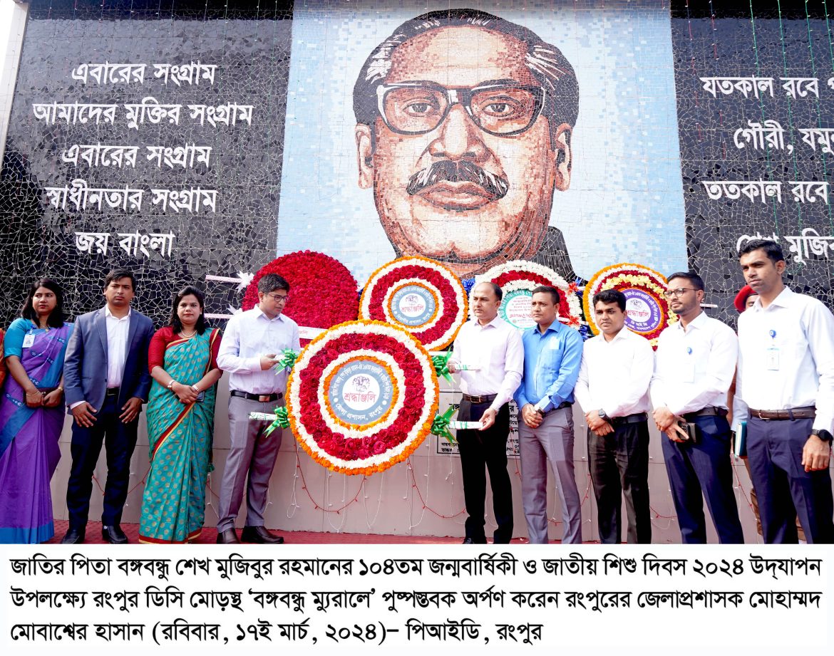জাতির পিতা বঙ্গবন্ধু শেখ মুজিবুর রহমানের ১০৪ তম জন্মবার্ষিকী উপলক্ষ্যে রংপুরের বিভিন্ন শ্রেণি-পেশার মানুষ ডিসি মোড়স্থ বঙ্গবন্ধুর ম্যুরালে ফুল দিয়ে শ্রদ্ধা নিবেদন করেন। ১৭ই মার্চ সকালে রংপুরের বিভাগীয় কমিশনার মোঃ হাবিবুর রহমান জাতির পিতার ম্যুরালে পুষ্পস্তবক অর্পণ করেন। এরপর রংপুর সিটি কর্পোরেশনের মেয়র মোঃ মোস্তাফিজার রহমান পুষ্পস্তবক অর্পণ করেন। এ ছাড়া রংপুর রেঞ্জের ডিআইজি, মেট্রোপলিটন পুলিশ কমিশনার, জেলাপ্রশাসক, পুলিশ সুপার, মুক্তিযোদ্ধা সংসদ, বিভিন্ন সরকারি দপ্তর, রাজনৈতিক সংগঠন, সামাজিক সংগঠন, পেশাজীবী সংগঠন-সহ বিভিন্ন শ্রেণি-পেশার মানুষ বঙ্গবন্ধুর ম্যুরালে পুষ্পস্তবক অর্পণ করে শ্রদ্ধা নিবেদন করেন। উল্লেখ্য, বঙ্গবন্ধুর ম্যুরালে শিশুদের জন্য ফুল দেওয়ার পৃথক ব্যবস্থা রাখা হয়। পুষ্পস্তবক অর্পণ শেষে গার্ড অব অনার প্রদান করা হয়।