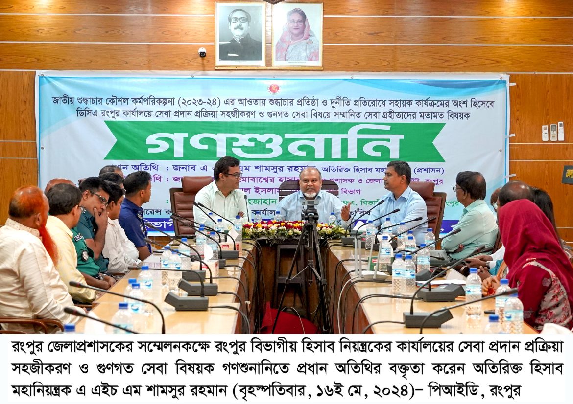 গণশুনারির শুরুতে রংপুর বিভাগীয় হিসাব নিয়ন্ত্রক মোহাম্মদ শাহজাহান বিভাগীয় হিসাব নিয়ন্ত্রক কার্যালয়ের সার্বিক কার্যক্রম বিষয়ক তথ্যচিত্র উপস্থাপন করেন। গণশুনানিতে সরকারি বিভিন্ন দপ্তরের কর্মকর্তা-কর্মচারী, সেবাপ্রত্যাশী ও সাংবাদিকবৃন্দ উপস্থিত ছিলেন।