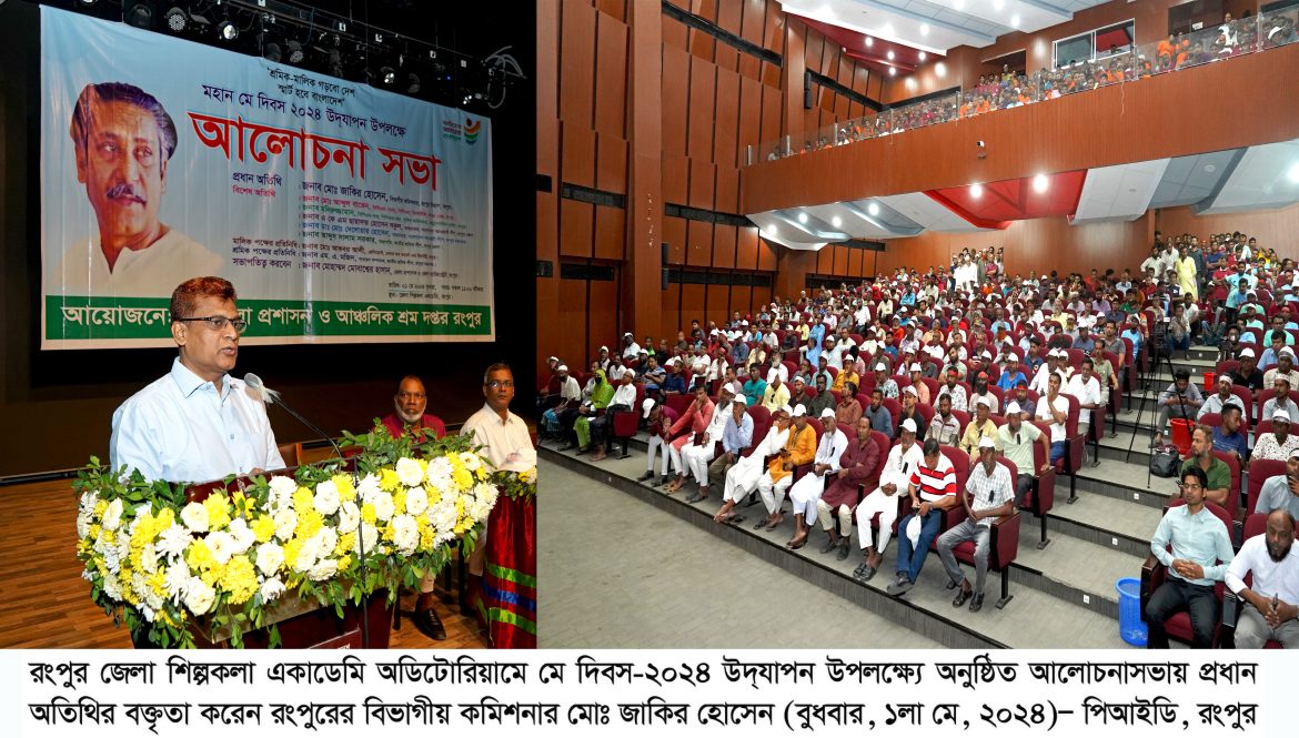 ‘শ্রমিক-মালিক গড়বো দেশ, স্মার্ট হবে বাংলাদেশ’— এই প্রতিপাদ্য নিয়ে রংপুরে ‘মে দিবস ২০২৪’ উদ্যাপিত হয়েছে। বুধবার (১লা মে) রংপুর জেলা শিল্পকলা একাডেমি অডিটোরিয়ামে দিবসটি উপলক্ষ্যে এক আলোচনা সভা অনুষ্ঠিত হয়। রংপুর জেলাপ্রশাসন ও আঞ্চলিক শ্রম দপ্তরের যৌথ উদ্যোগে অনুষ্ঠিত এই আলোচনা সভায় প্রধান অতিথি হিসাবে উপস্থিত ছিলেন রংপুরের বিভাগীয় কমিশনার মোঃ জাকির হোসেন। অনুষ্ঠানে সভাতিত্ব করেন জেলাপ্রশাসক মোহাম্মদ মোবাশ্বের হাসান।