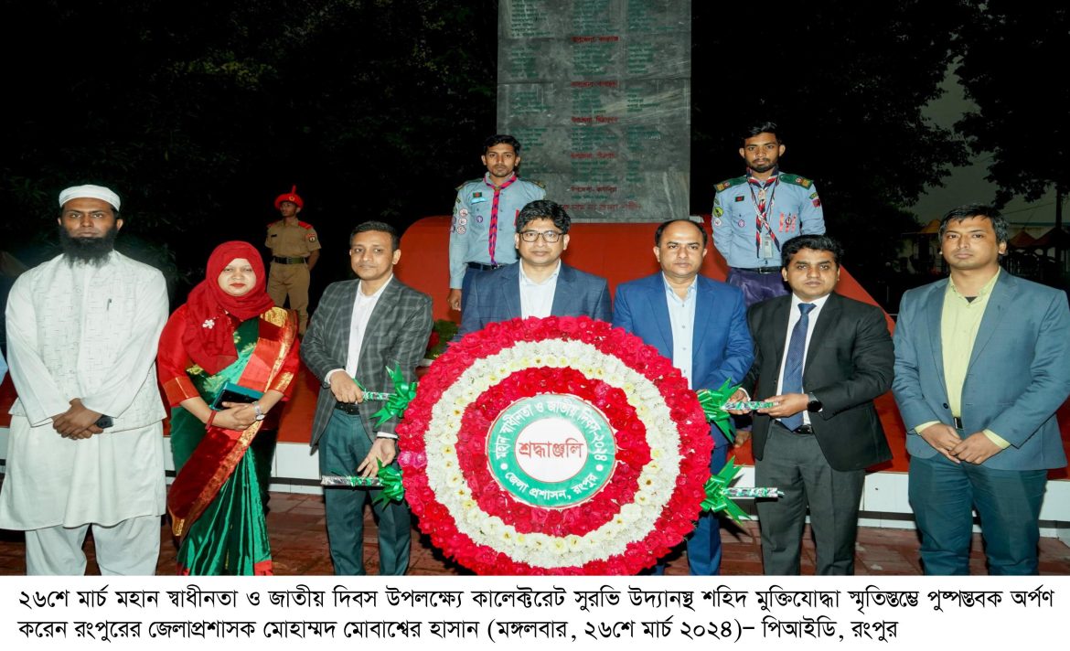 রংপুরে বিভিন্ন শ্রেণি-পেশার মানুষ মহান স্বাধীনতা ও জাতীয় দিবস উদ্যাপন উপলক্ষ্যে শহিদ মুক্তিযোদ্ধাদের প্রতি শ্রদ্ধা নিবেদন করেছেন। ২৬শে মার্চ সূর্যোদয়ের সঙ্গে সঙ্গে রংপুর মডার্ন মোড়স্থ স্বাধীনতা স্মৃতিস্তম্ভে বিভাগীয় কমিশনার মোঃ হাবিবুর রহমান পুষ্পস্তবক অর্পণ করেন। এরপর রংপুর সিটি কর্পোরেশনের মেয়র মোঃ মোস্তাফিজার রহমান, রংপুর রেঞ্জের ডিআইজি, মেট্রোপলিটন পুলিশের অতিরিক্ত পুলিশ কমিশনার, জেলাপ্রশাসক, পুলিশ সুপার, র্যাপিড অ্যাকশন ব্যাটালিয়নের অধিনায়ক, মুক্তিযোদ্ধা সংসদ, জেলাপরিষদ চেয়ারম্যান, বিভিন্ন সরকারি দপ্তর, রাজনৈতিক সংগঠন, সামাজিক সংগঠন, পেশাজীবী সংগঠন-সহ বিভিন্ন শ্রেণি-পেশার মানুষ মহান স্বাধীনতা ও জাতীয় দিবস উদ্যাপন উপলক্ষ্যে রংপুর মডার্ন মোড়স্থ স্বাধীনতা স্মৃতিস্তম্ভে পুষ্পস্তবক অর্পণ করে শহিদ মুক্তিযোদ্ধাদের প্রতি শ্রদ্ধা নিবেদন করেন। এছাড়া রংপুর ডিসি মোড়স্থ বঙ্গবন্ধু ম্যুরালে ও কালেক্টরেট সুরভি উদ্যানস্থ শহিদ মুক্তিযোদ্ধা স্মৃতিস্তম্ভে পুষ্পস্তবক অর্পণ করা হয়।