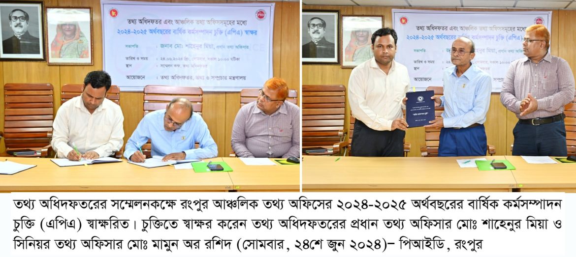 রংপুর আঞ্চলিক তথ্য অফিসের ২০২৪-২০২৫ অর্থবছরের বার্ষিক কর্মসম্পাদক চুক্তি (এপিএ) স্বাক্ষরিত হয়েছে। সোমবার (২৪শে জুন) সকালে তথ্য অধিদফতরের সম্মেলনকক্ষে এই চুক্তি স্বাক্ষর অনুষ্ঠিত হয়। তথ্য অধিদফতরের পক্ষে প্রধান তথ্য অফিসার মো: শাহেনুর মিয়া ও রংপুর আঞ্চলিক তথ্য অফিসের পক্ষে সিনিয়র তথ্য অফিসার মোঃ মামুন অর রশিদ এই চুক্তিতে স্বাক্ষর করেন। এপিএ স্বাক্ষর অনুষ্ঠানে সিনিয়র উপপ্রধান তথ্য অফিসার মুন্সী জালাল উদ্দিন, আঞ্চলিক তথ্য অফিসসমূহের প্রধানগণ-সহ তথ্য অধিদফতরের কর্মকর্তাবৃন্দ উপস্থিত ছিলেন।