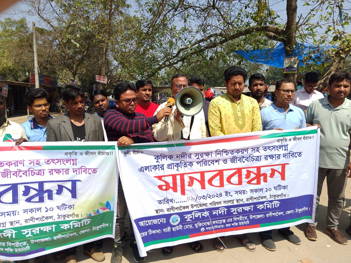 মানববন্ধনে বক্তারা কুলিক,নাগর,তিরনই নদী সুরক্ষার জন্য বলেন, রাণীশংকৈল পৌরসভার মধ্য দিয়ে প্রবাহিত ‘কুলিক’ নদীতে ড্রেজার মেশিন দিয়ে খননকার্য পরিচালনা করে নদীর গভীরতা বৃদ্ধির লক্ষ্যে প্রয়োজনীয় ব্যবস্থা গ্রহন, নদীর দুই পাড়ের ভাঙ্গন রোধে ব্লকপাথর দিয়ে বাধাঁই করার জন্য প্রয়োজনীয় ব্যবস্থা। কুলিক নদীর দুই পাড়ে পর্যাপ্ত বৃক্ষ রোপনের মাধ্যমে বনায়ন কার্যক্রম। নদীর দুই পাড়ে দখল উচ্ছেদ করিয়া নদীর সৌন্দর্য বৃদ্ধির লক্ষ্যে কুলিক নদীকে পর্যটক বান্ধব নদীতে রূপান্তরের করতে হবে। ঘন্টাব্যাপী মানববন্ধনে বক্তারা আরো বলেন, কুলিক নদীর পানিকে পরিষ্কার ও বিশুদ্ধ করার লক্ষ্যে প্রয়োজনীয় ব্যবস্থাগ্রহন করতে হবে। অতিথি পাখির নিরাপদ অশ্রয়স্থল অনিশ্চিত করতে হবে।