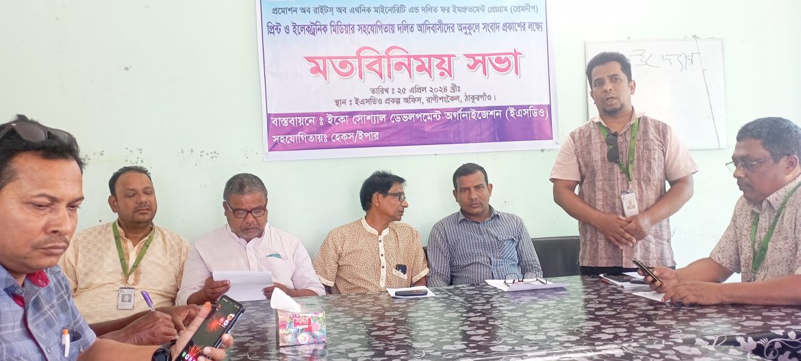 রানীশংকৈল (ঠাকুরগাঁও) প্রতিনিধিঃ রাণীশংকৈলে বৃহস্পতিবার সকালে ইএসডিও প্রকল্প অফিসে প্রেমদীপ প্রকল্পের আয়োজনে দলিত আদিবাসীদের অনুকূলে সংবাদ প্রকাশের লক্ষ্য মতবিনিময় সভা অনুষ্ঠিত হয়। সভায় প্রেমদীপ প্রকল্প ম্যানেজার খাইরুল আলমের সভাপতিত্বে উপস্থিত ছিলেন টিভ্যাট ও ইয়ুথ ডেভেলপমেন্ট অফিসার ম.শাহীন, ইডিও রিতা বেগম, সিএফ আনোয়ার হোসেন, সিএফ নাজমিন আকতার, উপজেলা আদিবাসী সমাজ উন্নয়ন সংগঠনের সাবেক সভাপতি সুগা মুরমু, সাধারণ সম্পাদক মতিলাল মুরমু, কান্ত পাহান সহ স্থানীয় প্রিন্ট ও ইলেক্ট্রনিক মিডিয়ার সাংবাদিকবৃন্দ প্রমূখ।