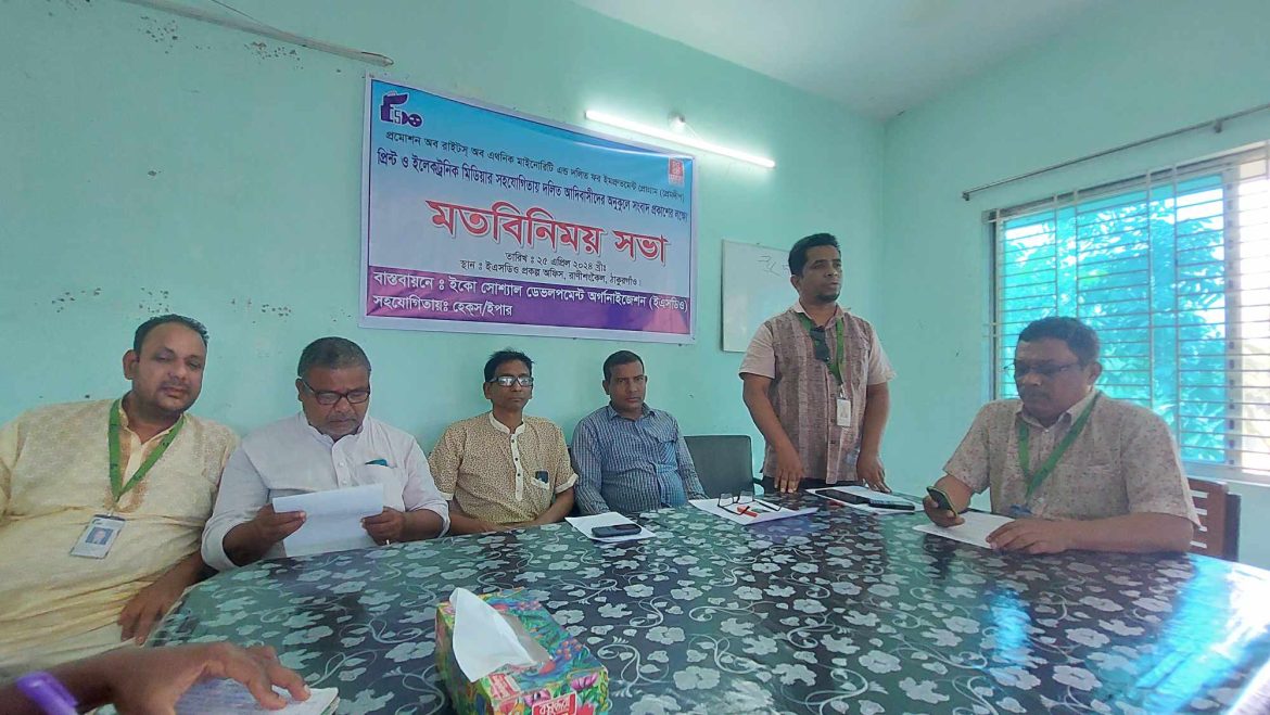 রাণীশংকৈল(ঠাকুরগাঁও)প্রতিনিধি।। ঠাকুরগাঁওয়ের রাণীশংকৈল পৌর শহরের বেসরকারি সংস্থা ইএসডিও”র অফিস সভাকক্ষে বৃহস্পতিবার ২৫ এপ্রিল সকাল ১০টায় স্থানীয় সাংবাদিকদের নিয়ে এক আলোচনা সভা অনুষ্ঠিত হয়। ইএসডিও’র প্রেমদীপ প্রকল্পের ম্যানেজার খায়রুল আলমের সভাপতিত্বে সভায় স্থানীয় প্রিন্ট ও ইলেকট্রনিক মিডিয়ার সাংবাদিক,আদিবাসী সংগঠনের নেতাকর্মী ও সংশ্লিষ্ট সংস্থার কর্মকর্তারা উপস্থিত ছিলেন। স্বাগত বক্তব্য দেন- জেলা ইএসডিও’র সিনিয়র কর্মকর্তা মোহাম্মদ শাহীন। তিনি তার বক্তব্যে উপজেলার প্রেমদীপ প্রকল্পের আওতায় বিভিন্ন অর্থনৈতিক উন্নয়ন ও অর্জনের তথ্য তুলে ধরেন। আরো বক্তব্য দেন- প্রেসক্লাব(পুরাতন)সভাপতি অধ্যাপক আনোয়ারুল ইসলাম, সিনিয়র সদস্য আনিসুর রহমান বাকী, প্রেসক্লাব সভাপতি মোবারক আলী, সহসভাপতি হুমায়ুন কবির, সম্পাদক মোঃ বিপ্লব, সহসম্পাদক রফিকুল ইসলাম সুজন, ইএসডিও কর্মকর্তা নূর আলম,আদিবাসী নেতা সুগা মুরমু ও মতিলাল মুরমু প্রমুখ। আদিবাসী নেতারা তাদের বক্তব্যে তাদের ভাষা ও সংস্কৃতিগত সমস্যার কথা তুলে ধরেন। এ বিষয়ে তারা সরকারি পদক্ষেপ কামনা করেন।