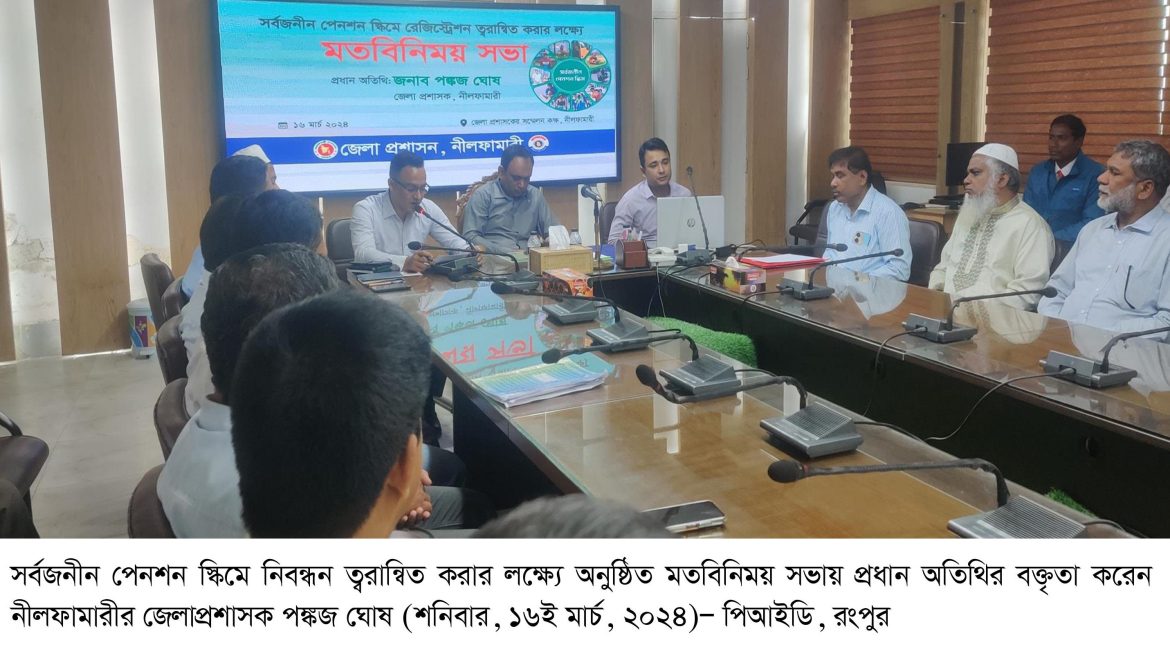 সর্বজনীন পেনশন স্কিমে নিবন্ধন ত্বরান্বিত করার লক্ষ্যে নীলফামারী জেলার ইউনিয়ন পরিষদ সচিবদের অংশগ্রহণে এক মতবিনিময় সভা অনুষ্ঠিত হয়েছে। শনিবার (১৬ই মার্চ) নীলফামারী জেলাপ্রশাসকের সম্মেলনকক্ষে অনুষ্ঠিত সভায় প্রধান অতিথি হিসাবে উপস্থিত ছিলেন জেলাপ্রশাসক পঙ্কজ ঘোষ। নীলফামারী জেলাপ্রশাসন এ সভার আয়োজন করে। মতবিনিময় সভায় বিশেষ অতিথি হিসাবে উপস্থিত ছিলেন নীলফামারীর অতিরিক্ত জেলাম্যাজিস্ট্রেট সাইদুল ইসলাম ও অতিরিক্ত জেলাপ্রশাসক (সার্বিক) ফারুক-আল-মাসুদ।