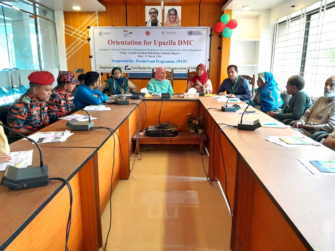 স্টাফ রিপোর্টার: বিশ্ব খাদ্য কর্মসূচী (World Food Programme) WFP সহায়তায় ইকো-সোশ্যাল ডেভলপমেন্ট অর্গানাইজেশন (ইএসডিও) কর্তৃক বাস্তবায়নাধীন বগুড়া জেলার সোনাতলা উপজেলা Anticipatory Action প্রকল্পের আওতায় বন্যার আগাম পূর্বাভাস ভিত্তিক সারাদিন কার্যক্রম সম্পর্কে এক ওরিয়েন্টেশন সভা অনুষ্ঠিত হয়েছে।