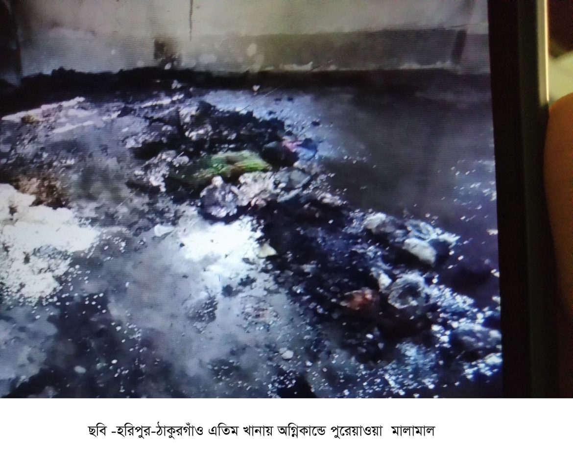 হরিপুর(ঠাকুরগাঁও) প্রতিনিধিঃ ঠাকুরগাঁওয়ের হরিপুরে তোররার মাজেদিয়া হেবজুল কোর আন মাদ্রাসা ও এতিম খানায় এক অগ্নিকান্ডের ঘটনা ঘটেছে। এ ঘটনায় এতিম খানার প্রায় ৬০ থেকে ৭০ হাজার টাকার ক্ষয়ক্ষতি হয়েছে বলে এতিম খানার প্রধান হাফেজ মুনসুর আলম জানান। এ সময় তিনি বলেন, দুপুর একটা ২০ মিনিটের সময় এতিম খানায় আমার রুমে জানালার ফাঁক দিয়ে রুমের ভিতরে কে বা কারা আগুন দিয়ে পালিয়ে যায়। এতে আগুন রুমের ভিতরে ছরিয়ে পরে। হরিপুর ফায়ার সাভির্স ঘটনা স্থলে গিয়ে আগুন নিয়ন্ত্রনে নিয়ে আসে। এরই মধ্যে রুমে থাকা কোর আন হাদিসের ৭টি কিতাব, এটি ফেন, একটি মোবাইল, বিছানার খাট ও কাপর চোপর সব কিছুই পুরে ছাই হয়ে গেছে। এতে এতিম খানার ব্যাপক ক্ষয়ক্ষতি হয়েছে।