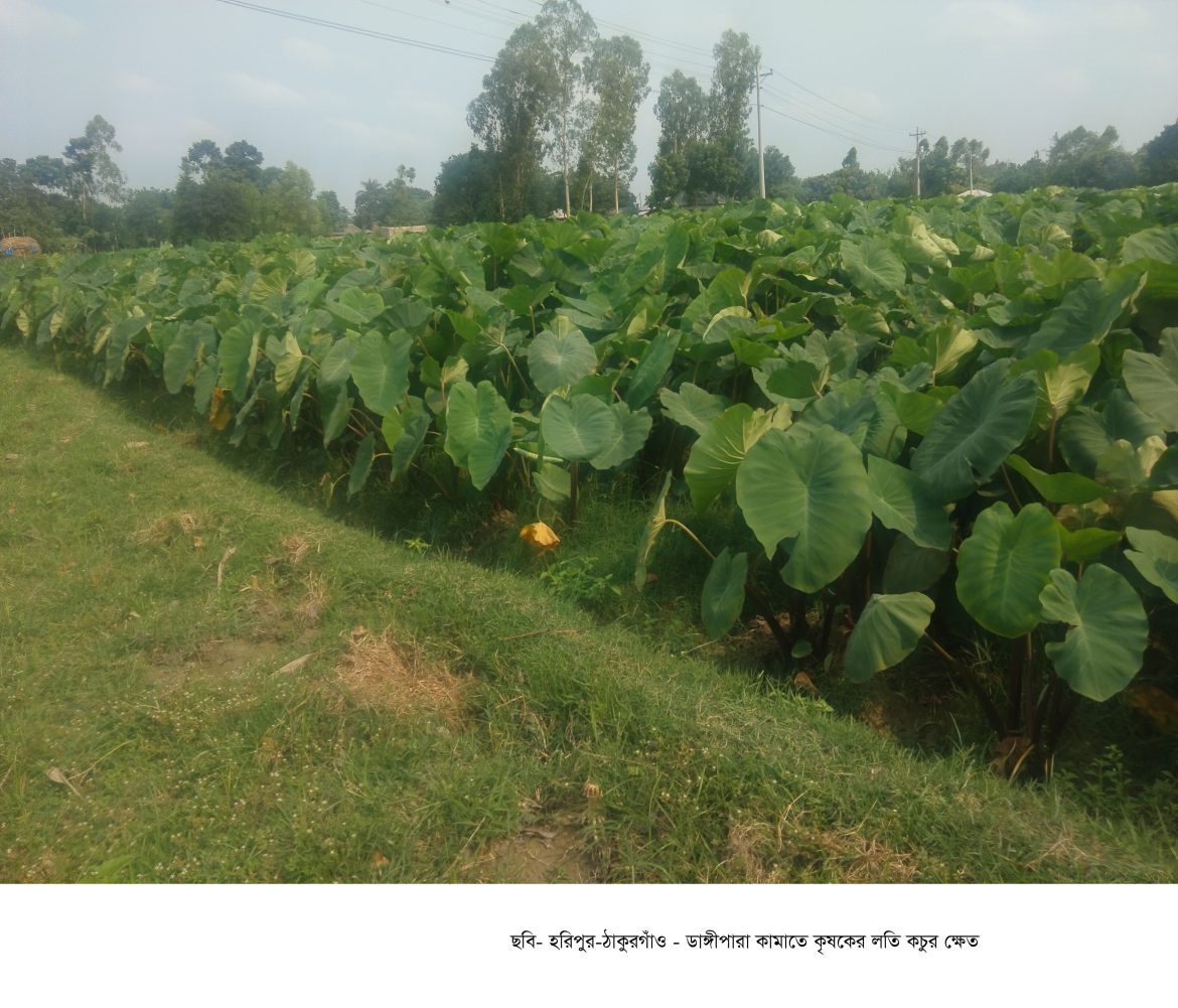 হরিপুর কৃষি অফিস সূত্রে জানা যায়, কচুর আবাদ কম হলেও আবহাওয়া অনুকূলে থাকায় এবার ৭হেক্টর জমিতে লতিকচু ও দেশী কচু সহ বিভিন্ন জাতের কচুর আবাদ হয়েছে। হরিপুর উপজেলার ডাঙ্গীপাড়া গ্রামের কৃষক আঃ মালেক বলেন, আমি দুই বিঘা জমিতে কচু চাষ করেছি। কচু চাষে কীটনাশক ব্যবহার না করলেও চলে। তবে ক্ষেতে পানি সেচ ও রাসায়নিক সার ব্যবহার করতে হয়। এবার কচু চষের জন্য উপযুক্ত আবহাওয়াও ছিল। তাই এবার কচুর ফলন গত বারের চেয়ে বেশি হচ্ছে। বর্তমানে বাজারে দেশী কচু একশত টাকা কেজি বিক্রয় হচ্ছে। আর কচুর লতি ৫০ টাকা কেজি বিক্রয় হচ্ছে। কাচা মাল ব্যবসায়ীরা আমাদের ক্ষেতে এসে নিয়ে যাচ্ছে। কচু তুলার পর ওই জমিতে আমন ধান লাগানো হবে। উপজেলা কৃষি কর্মকর্তা রুবেল হুসেন বলেন, কচু চাষের প্রতি এ উপজেলার কৃষকের দিন দিন অগ্রহ বারছে। কচু চাষের কম খরচে অল্প সময়ের মধ্যে অধিক ফলন ও দাম ও ভালো পাওয়া যায়। এতে কৃষক অতি সহজেই তার ক্ষতি পূশিয়ে নিতে পারে।