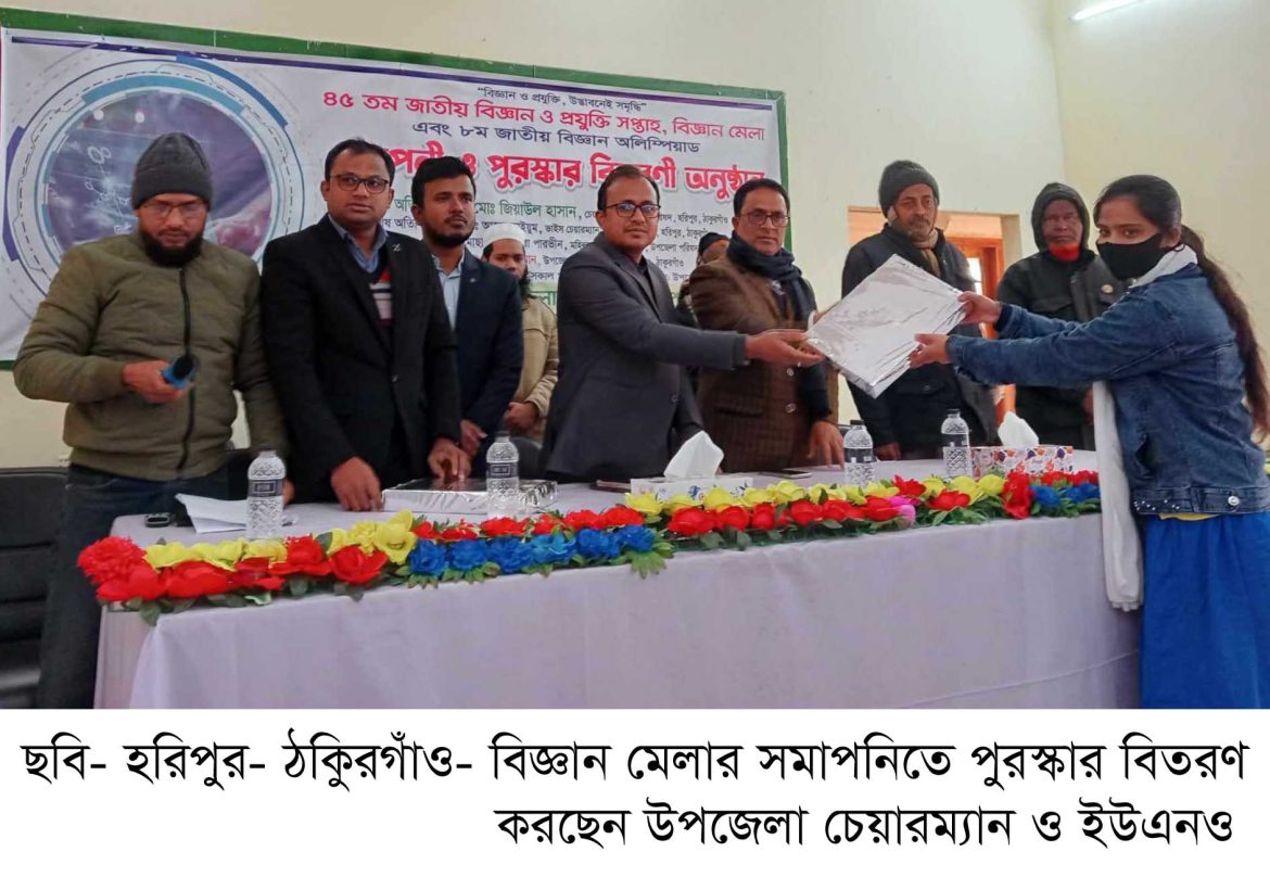 হরিপুর (ঠাকুরগাঁও) প্রতিনিধিঃ ঠাকুরগাঁওয়ের হরিপুরে দুইদিন ব্যাপি জাতীয় বিজ্ঞান ও প্রযুক্তি মেলার সমাপনিতে বুধবার পুরস্কার বিতরণ ও আলোচনা সভা অনুষ্ঠিত হয়েছে। উপজেলা নির্বাহী কর্মকর্তার আরিফুজ্জামানের সভাপতিত্বে দুপুর ১২ টায় পরিষদের অডিটোরিয়ামে পুরস্কার বিতরণ ও আলোচনা সভা অনুষ্ঠিত হয়। এতে বক্তব্য রাখেন উপজেলা পরিষদ চেয়ারম্যান ও আওয়ামী লীগ সভাপতি জিয়াউল হাসান, সমাজসেবা অফিসার রাফিউল ইসলাম, বীর মুক্তিযোদ্ধা নগেন কুমার পাল, মাধ্যমিক একাডেমিক সুপারভাইজার সামসুদ্দিন প্রমুখ। আলোচনা সভাশেষে বিভিন্ন শিক্ষা প্রতিষ্ঠান থেকে মেলায় অংশ গ্রহন কারি ১২ টি স্টলের মাঝে পুরস্কার বিতরণ করা হয়েছে।
