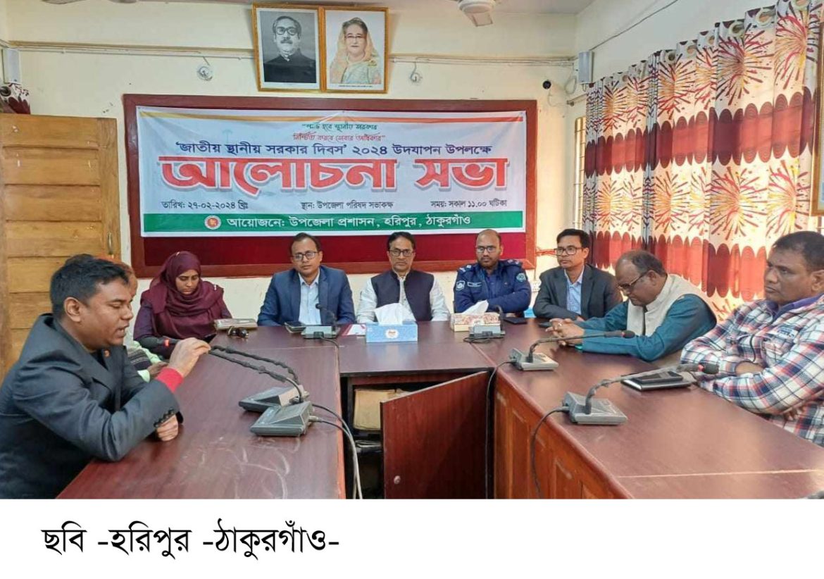 হরিপুর (ঠাকুরগাঁও) প্রতিনিধিঃ ঠাকুরগাঁওয়ের হরিপুরে উপজেলা প্রশাসনের আয়োজনে স্থানীয় সরকার দিবস পালন উপলক্ষে র্যালী ও আলোচনা সভ অনষ্ঠিত হয়েছে। মঙ্গলবার সকাল সাড়ে ১১ টায় পরিষদের সভাকক্ষে নির্বাহী কর্মকর্তা আরিফুজ্জামানের সভাপতিত্বে সভা অনুষ্ঠিত হয়। এতে বক্তব্য রাখেন উপজেলা পরিষদ চেয়ারম্যান ও আওয়ামীলীগ সভাপতি জিয়াউল হাসান, সম্পাদক এস এম আলমগীর, উপজেলা প্রকৌশলী মাইনুল ইসলাম, থানার অফিসার ইনচার্জ আব্দুল লতিফ শেখ, মাধ্যমিক শিক্ষা অফিসার রাইহানুল ইসলাম মিঞা সহ ইউনিয়ন চেয়ারম্যান গণ প্রমুখ।