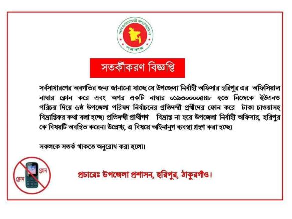 হরিপুর (ঠাকুরগাঁও) প্রতিনিধি: ঠাকুরগাঁওয়ের হরিপুর উপজেলা নির্বাহী অফিসারের সরকারি মোবাইল নম্বর ক্লোন করে একটি অসাধু প্রতারক চক্র উপজেলা পরিষদ নির্বাচনে প্রতিদন্দী একাধিক প্রার্থীর নিকট থেকে টাকা দাবী করার অভিযোগ উঠেছে ।