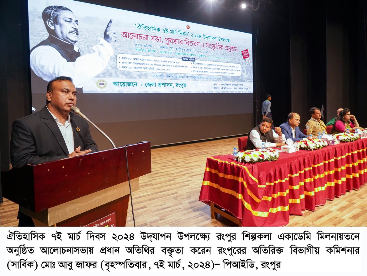 ৭ই মার্চের ভাষণের অনুপ্রেরণায় স্মার্ট নাগরিক গড়ে উঠবে। আজকের তরুণ প্রজন্মই স্মার্ট বাংলাদেশের নেতৃত্ব দেবে। তাই তাদের ৭ই মার্চের ভাষণের তাৎপর্য জানা উচিত। বৃহস্পতিবার (৭ই মার্চ) সকালে রংপুর জেলা শিল্পকলা একাডেমি অডিটোরিয়ামে ‘ঐতিহাসিক ৭ই মার্চ’ উদ্‌যাপন উপলক্ষ্যে আলোচনা সভা, পুরস্কার বিতরণ ও সাংস্কৃতিক অনুষ্ঠানে প্রধান অতিথির বক্তৃতায় রংপুরের অতিরিক্ত বিভাগীয় কমিশনার (সার্বিক) মোঃ আবু জাফর এসব কথা বলেন।