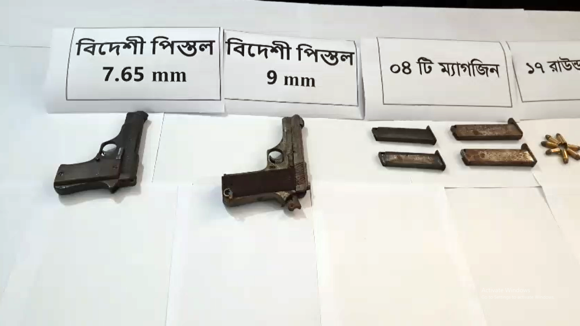 উদ্ধারকৃত আগ্নেয়াস্ত্রগুলো হলো- ৭ দশমিক ৬৫ এমএম সাইজের একটি বিদেশী পিস্তল, অপরটি ৯ এমএম সাইজের একটি বিদেশী পিস্তল। এছাড়াও ৪টি ম্যাগজিন ও ১৭ রাউন্ড গুলি।